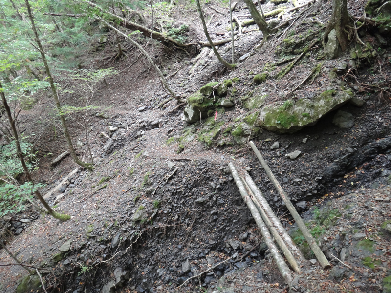 ここからは比較的平坦な道が続くのだけど、歩きにくいので思ったようにスピードが出せない。 丸石手前の登りは、けっこう急でしんどかった……