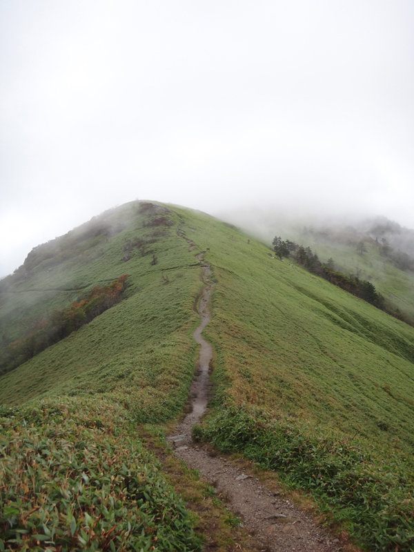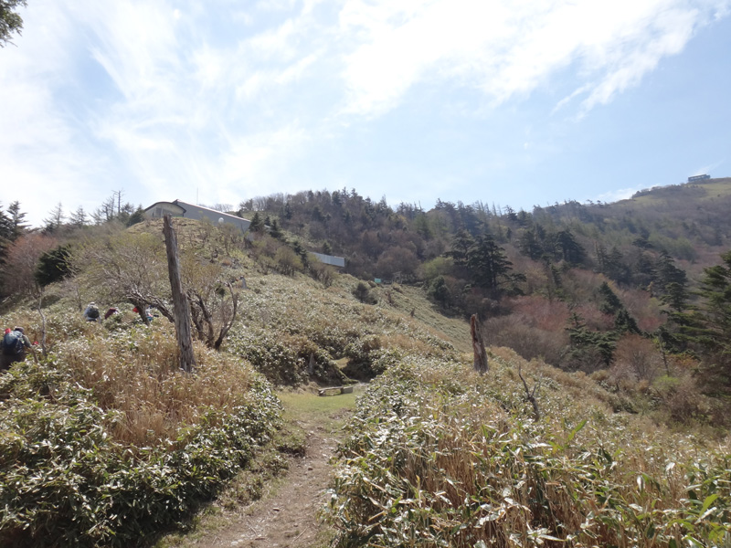 そのまま一気に見ノ越まで下りていく。 見ノ越に向かっている途中で、この時間から登ってくるグループと2組すれ違った。 1組目は単独男性で、長靴ででかいカメラを持っていたので写真撮影が目的っぽい。 2組目は若い男性2人組で、見ノ越に来たから登ってみるか、みたいな装備だった。