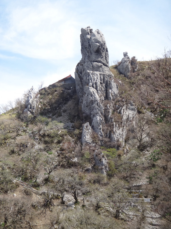 友達は鎖場初体験。 岩と岩に挟まれた鎖場なのだけど、その狭さに驚いていた。 雨で石灰岩が濡れていてものすごい滑りやすくなっている。 落ちないように気をつけて登って行ってもらう。 初めての鎖場はけっこう苦労していたように見えた。 鎖場を越えて、細いはしごを越えて、急な道を少し登ったら、刀掛けの松直上の登山道と合流。 すぐに山頂広場だ。