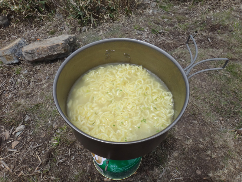 おにぎり食べながらお湯を沸かし、インスタントラーメンを作る。 今日は切り餅を持ってきてあるので、それをラーメンの中に入れて、力ラーメンにする。 が、ラーメンがとんこつだったので、餅と相性が悪かった……