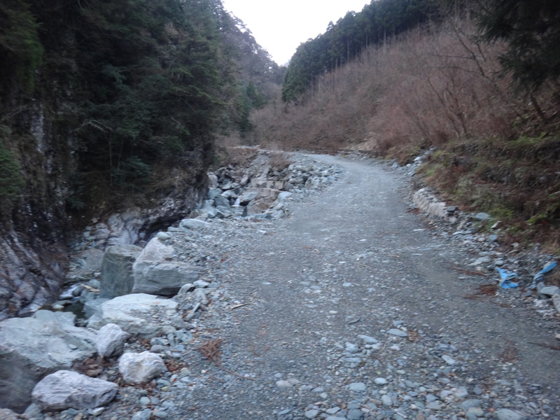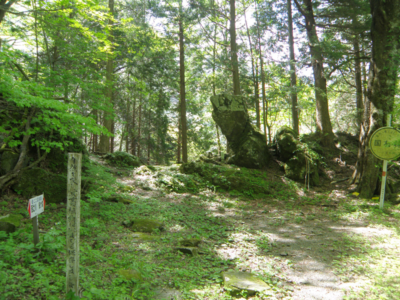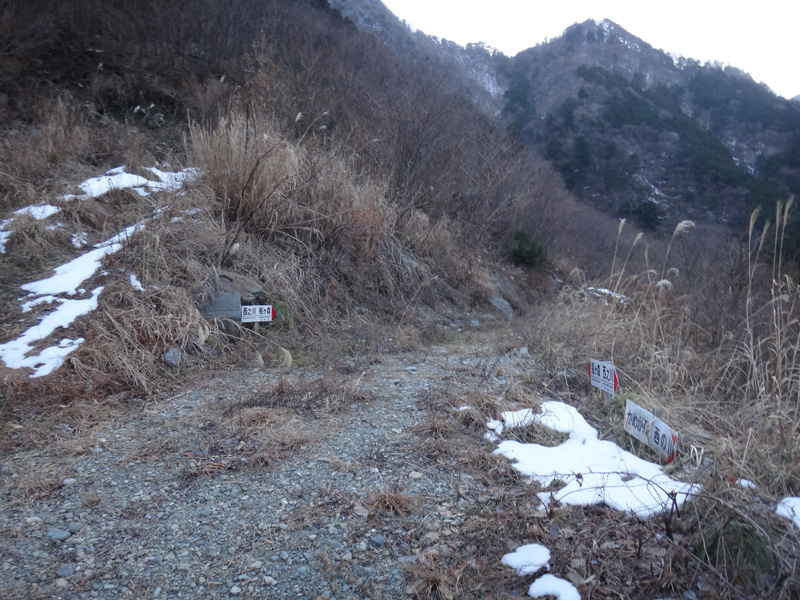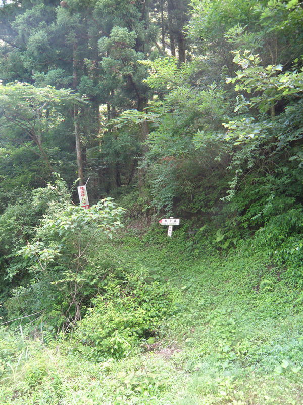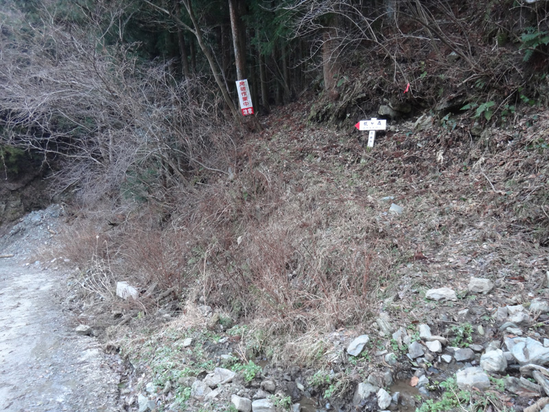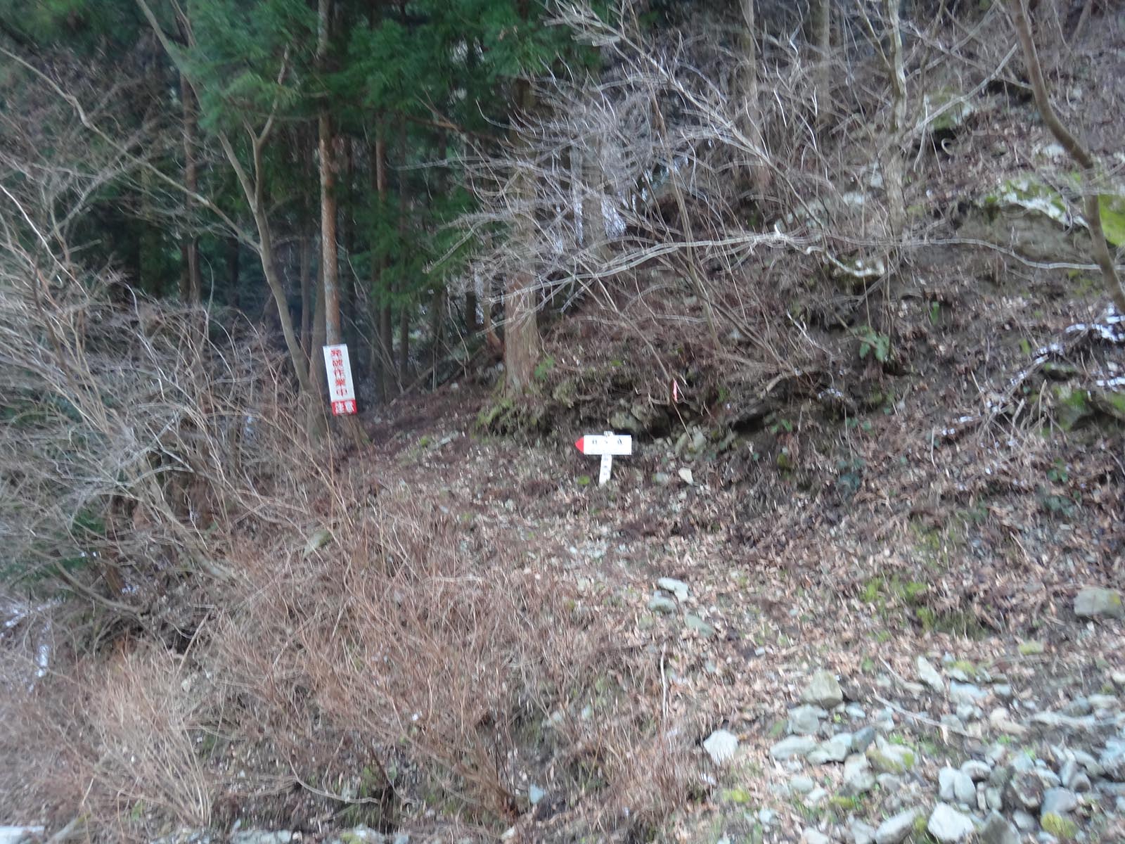 さらに30分くらい歩いたところで、新道と旧道の分岐に到着。 新道は崩落のため通行止めらしい。 もう何年も通れないのかな? 新道の踏み跡は消えていて、どこが新道なのかすらわからないような状態だった。