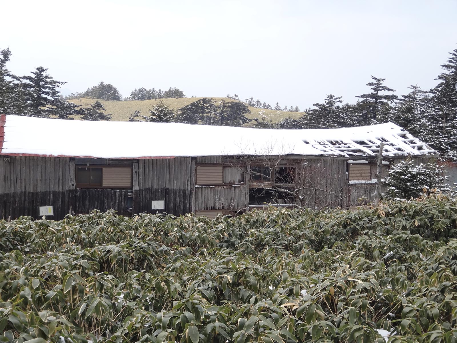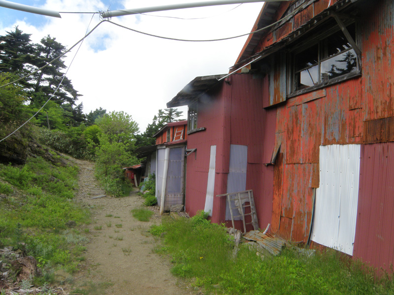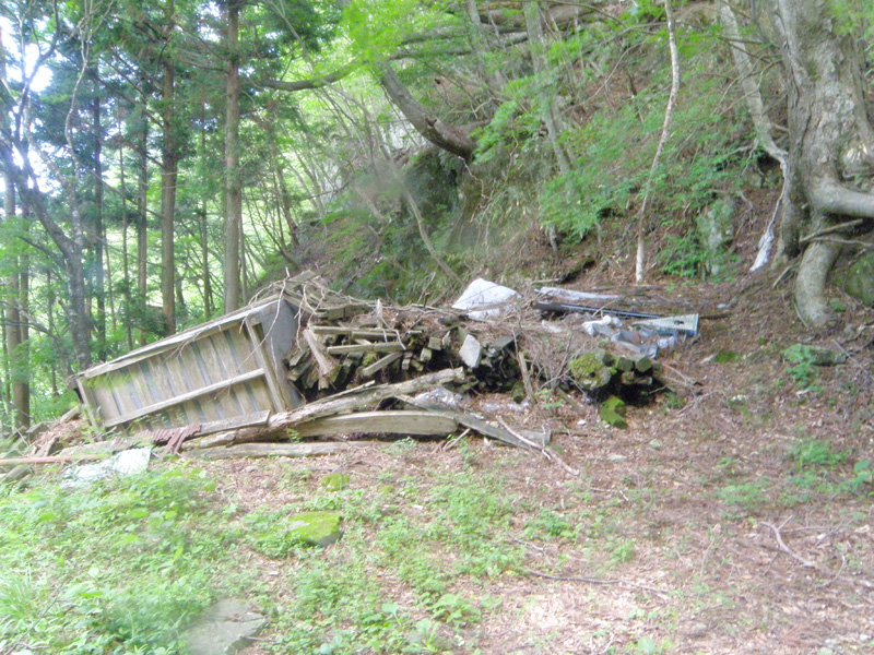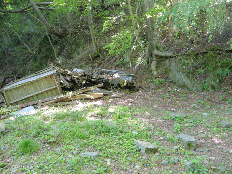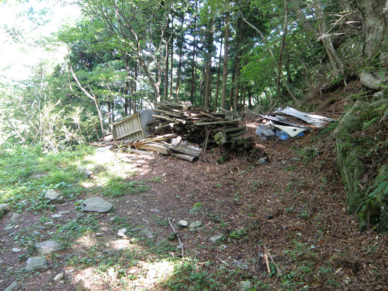 ここは名前の通り昔は人が住んでいたらしい。 小屋の廃材が残っていた。 しばらく休憩したのだが、風の通り道になっているらしく、ものすごい強風が吹き荒れる。 さっきまで暑かったのに少し寒いくらいだ。