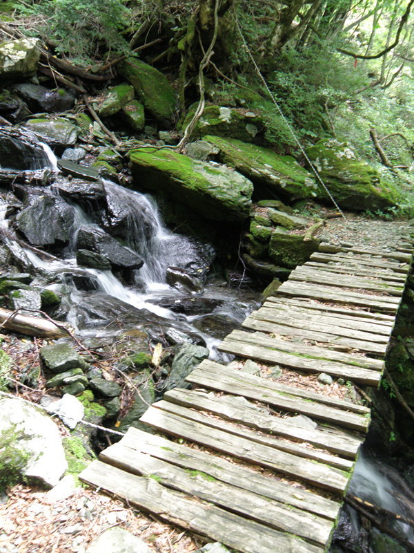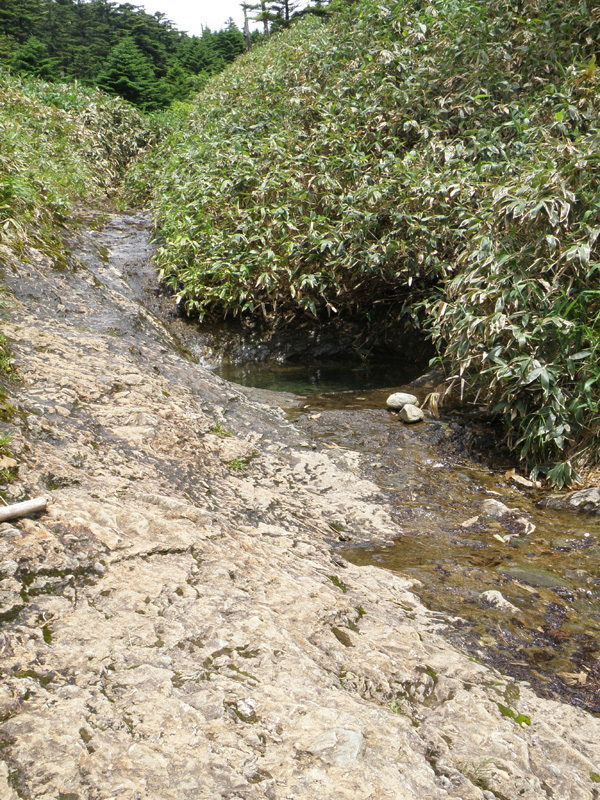 体力も回復したので、先に進もうか。 ここからは緩やかな道が45分くらい続くらしい。 しばらく歩いていると沢があったので、手と顔を洗っていった。 山の水は冷たくて気持ちいい。