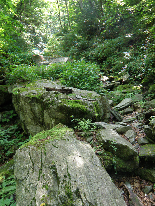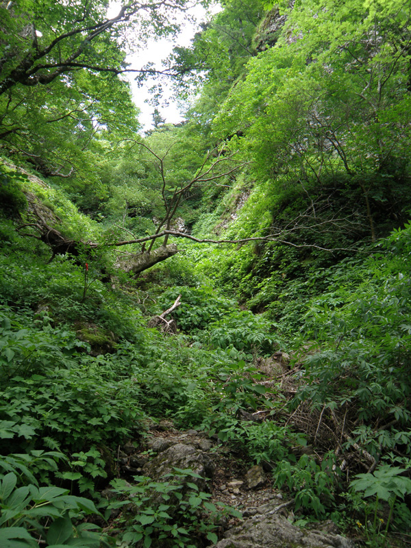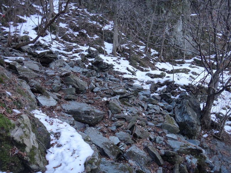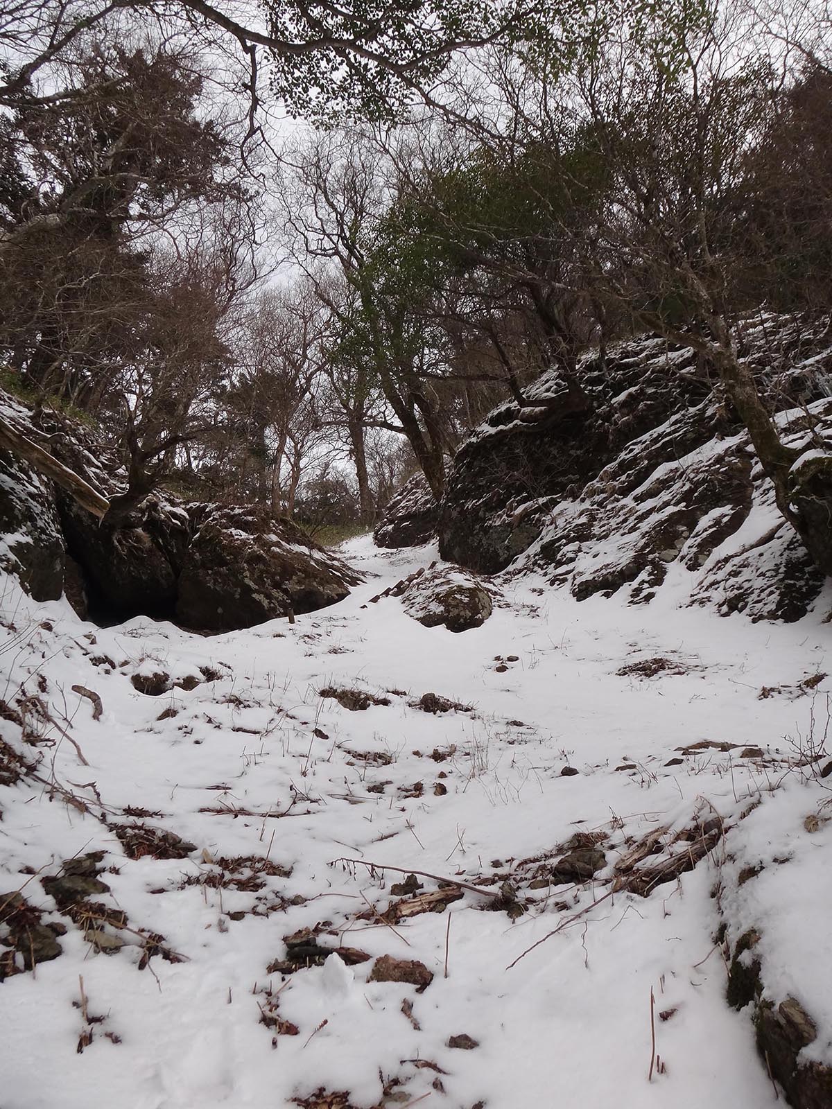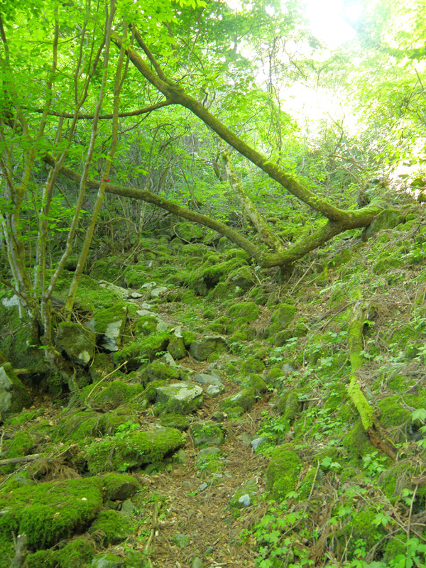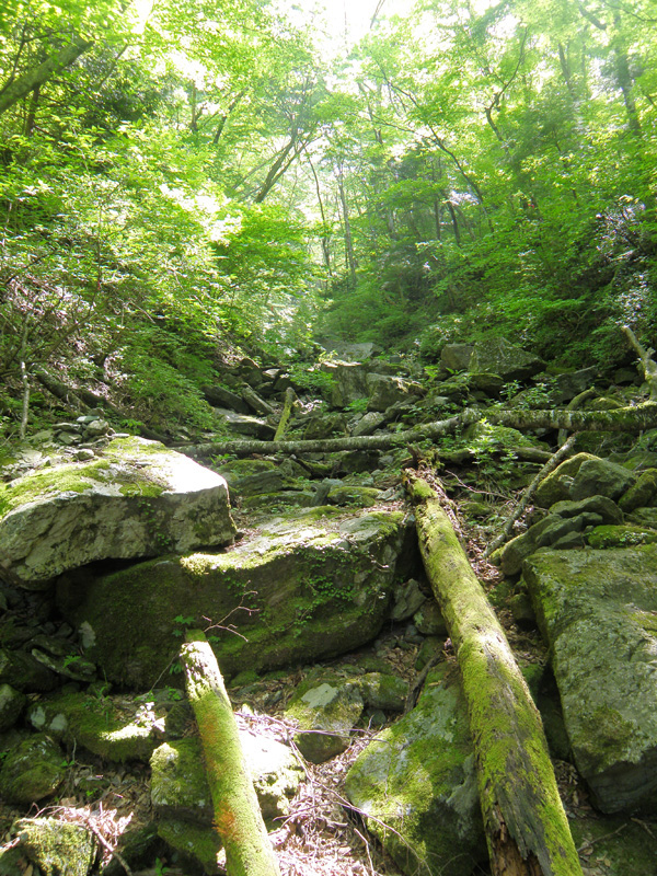この沢を越えたら、道は枯れ沢を上る道に変わった。 苔むしている岩や、湿った岩があって滑りそうで怖いな。 雨の日はこの沢を水が流れるだろうから、危なすぎて歩けないな。