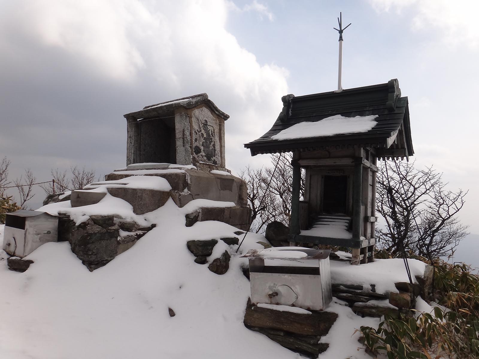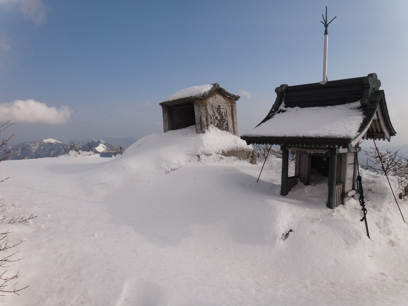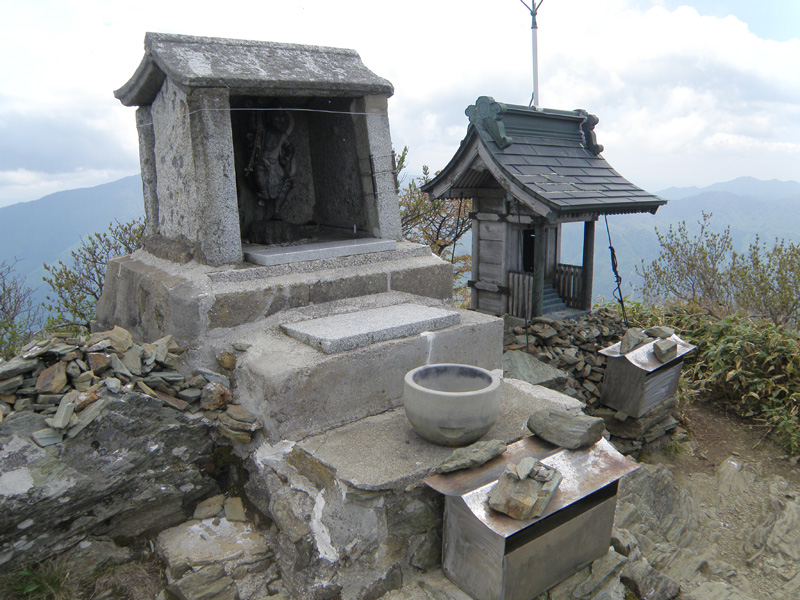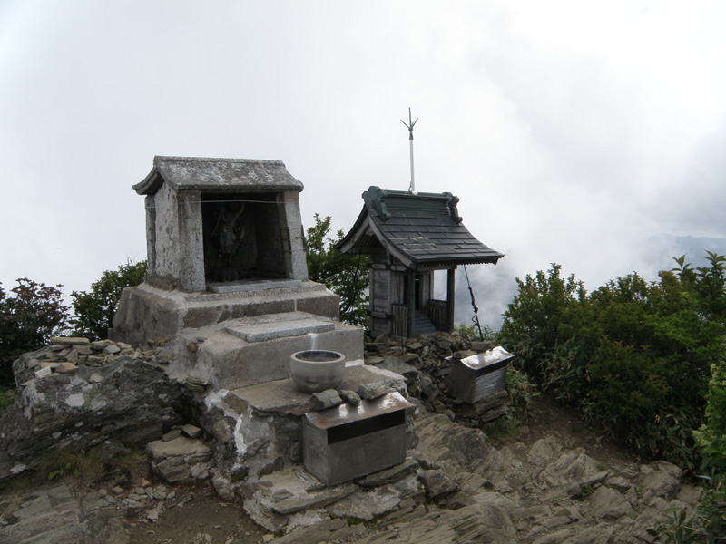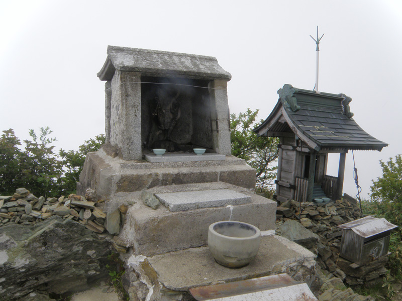 鎖を登りきったら山頂かと思っていたが、かなり急な笹原を10分くらい歩く。 ようやく、本堂に到着。