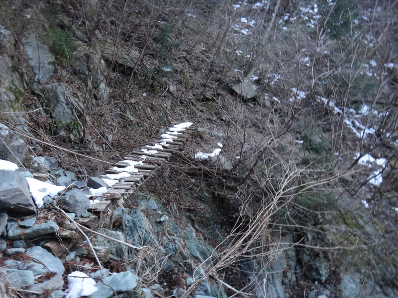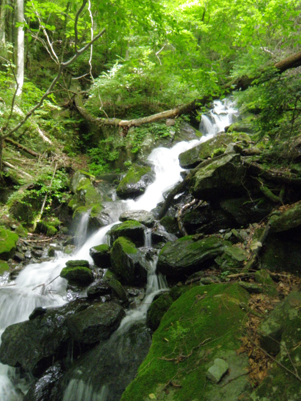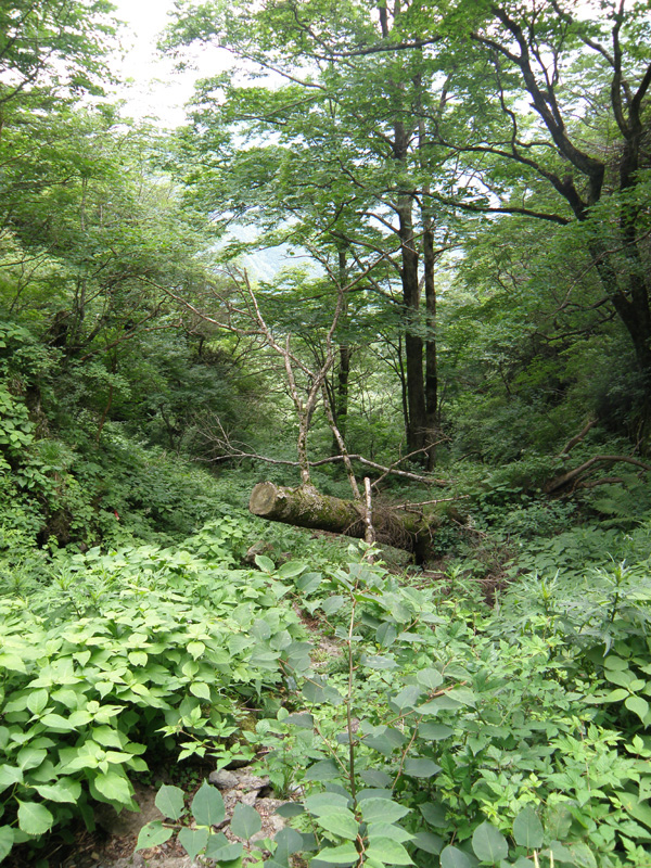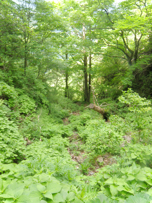 ここから瓶壺までの区間、夏場のコースタイムが1時間となっている。 が、高低差は450mほどあり、谷の右側を歩く前半と、谷の左側を歩く後半で、内容ががらりと変わる。 谷の右側は比較的緩やかな上りがグネグネと続いていく。 谷を渡ると、今度は一直線に登る、ものすごい急な道へと変わる。 2年前の冬場に登っているが、この区間はかなり苦労した。
