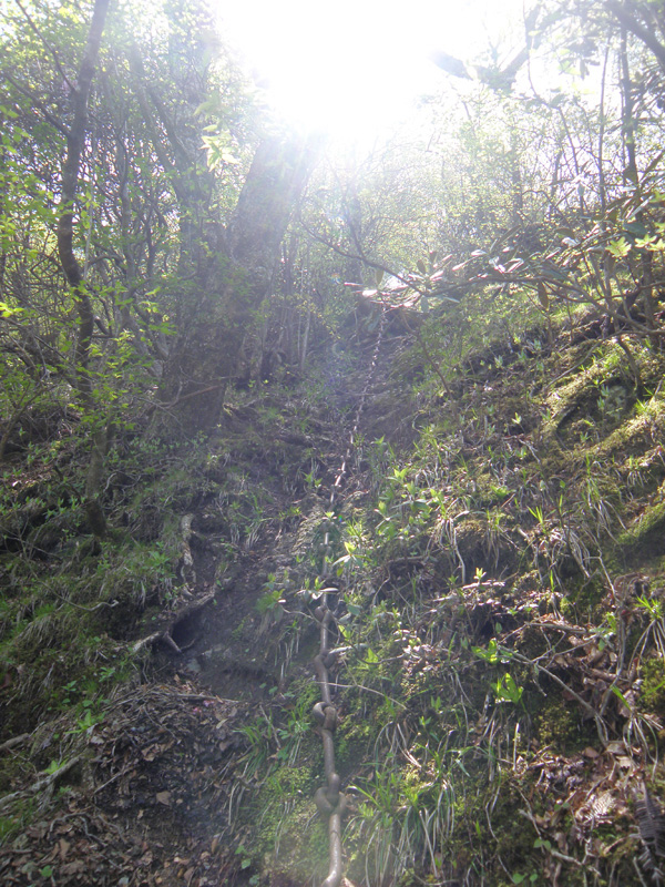 前回もここまでは来た。 さて、この先は初めて歩く道だ。 少し歩くと、鎖が出現。 これが三ノ鎖か? 鎖がなくても登れそうな感じだ。