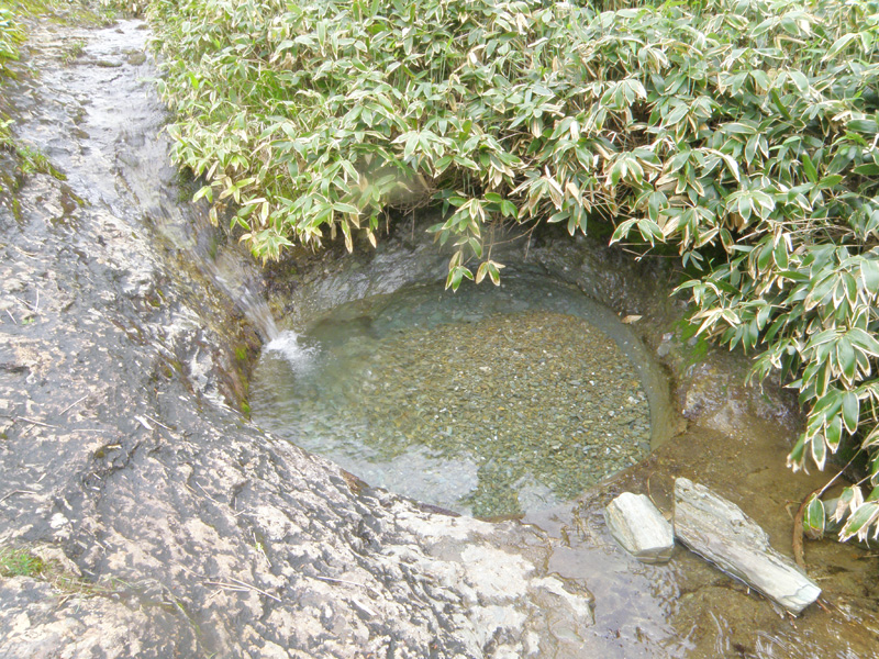 ここでボランティアか何かで山のゴミを拾っている2人組の人と少し話をした。 この瓶壷の深さは140cmくらいあるらしい。 上から見るとすごい浅く見えるけど、実際入ってみると深いんだって。 実はここ、瓶ヶ森林道の駐車場から20分くらい歩いたらたどり着ける場所。 なので、水汲みに来ている人がいっぱいいた。 この水は、一応飲める水なのだけど、オレはとても飲む気がせず……