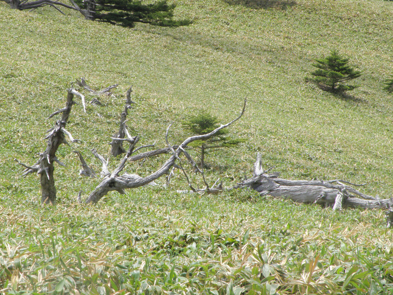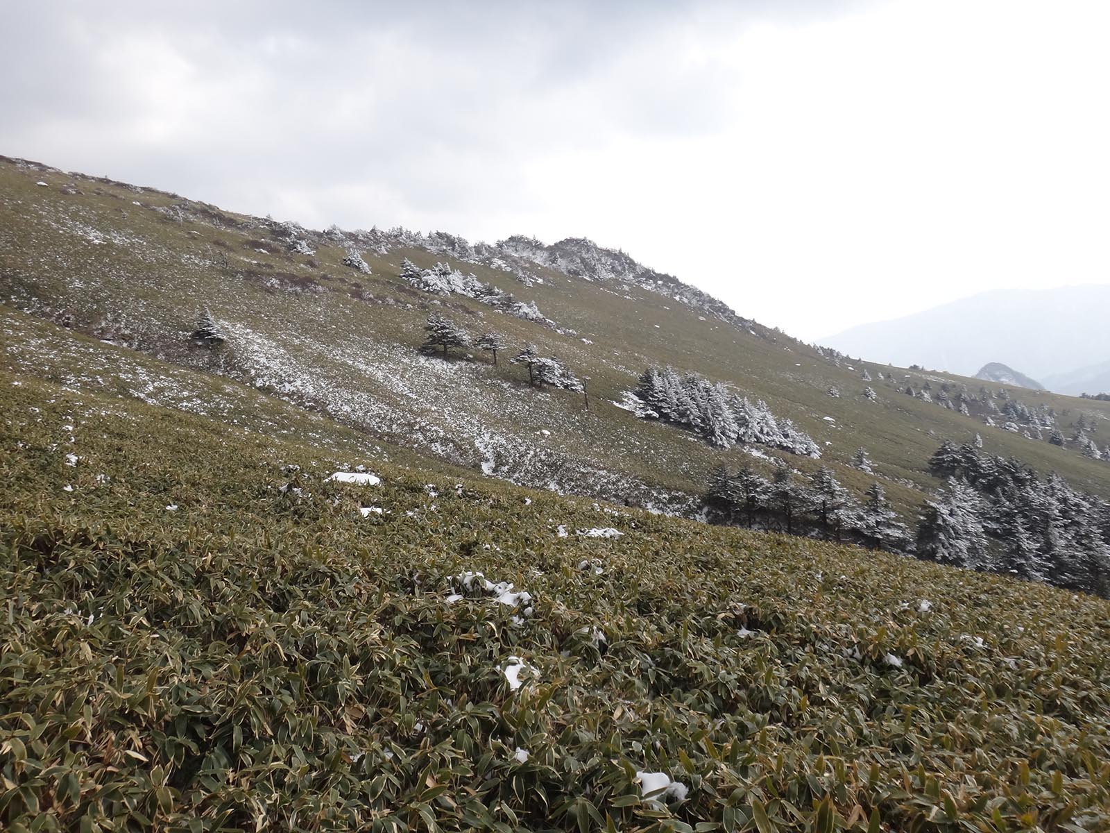ここからは、瓶ヶ森ヒュッテの方の登山道のあるらしき道を一直線に下りていく。 下りでかなり楽なのだけど、たまに腰まで埋まり、抜け出すのに苦労する。 だいたいの登山道の位置はわかるけど、もうどこがどこだかよくわからないな。 登山道を外すと、笹地帯なので、埋まりすぎる……