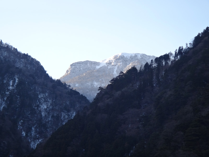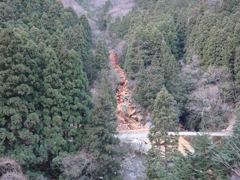 今までは林道に入る直前にある空き地に止めていたのだけど、去年くらいから閉鎖されてしまって、止めることができなくなってしまった。 林道は悪路なので、あまり走りたくないのだけど…… しばらく走ると赤谷がある。 緑の森の中に茶色の岩がゴロゴロしている。 周りが緑なので、茶色じゃなく赤くみえるほど、色鮮やか。 そのすぐ先に、路肩が広くなっている場所があるので、そこに駐車して登山の準備をする。 今日は冬山フル装備で挑む。 てっきり雪はほとんど無いと思っていたのだけど、道中見えた石鎚山が思っていたよりも白かったので、上の方は雪がある模様。