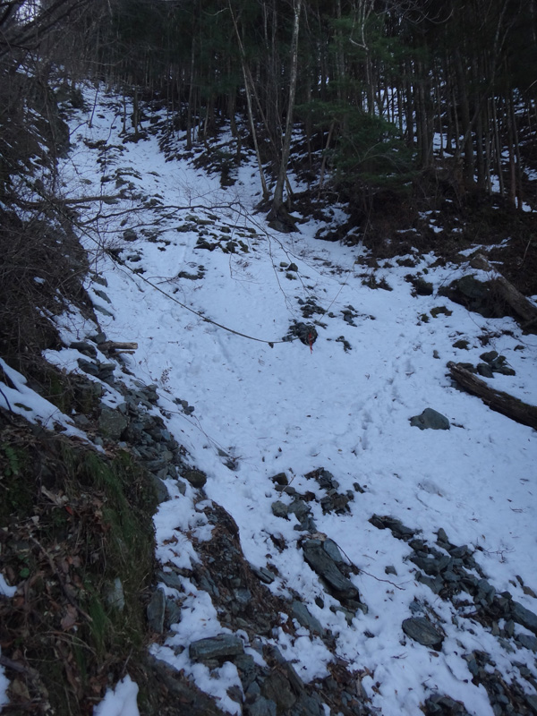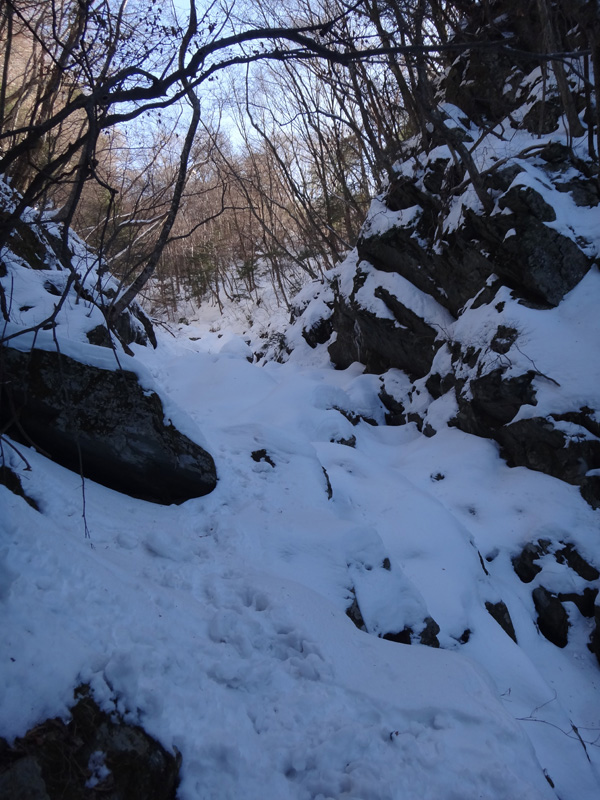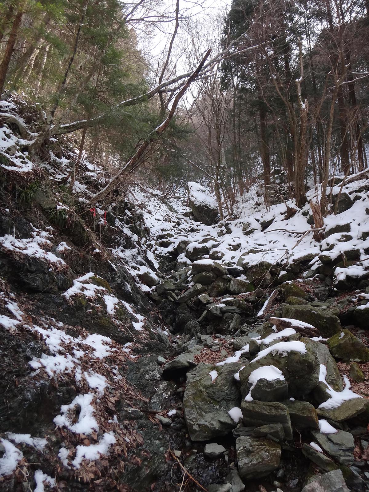 今回は雪はそれほどでもないから、なんとかなるか。 まずは右側の区間、雪で少し滑りながら登って行く。 途中にあった大木またぎがなくなっていたり、少し道が整備されているような感じだった。 そして谷の左側へ。 一直線に登って行く。 ところどころ立ち止まって休みながら。