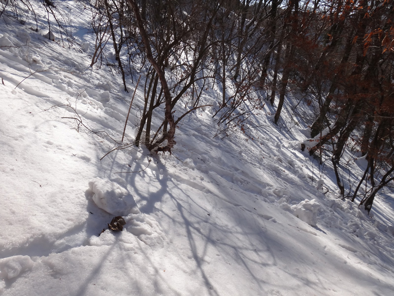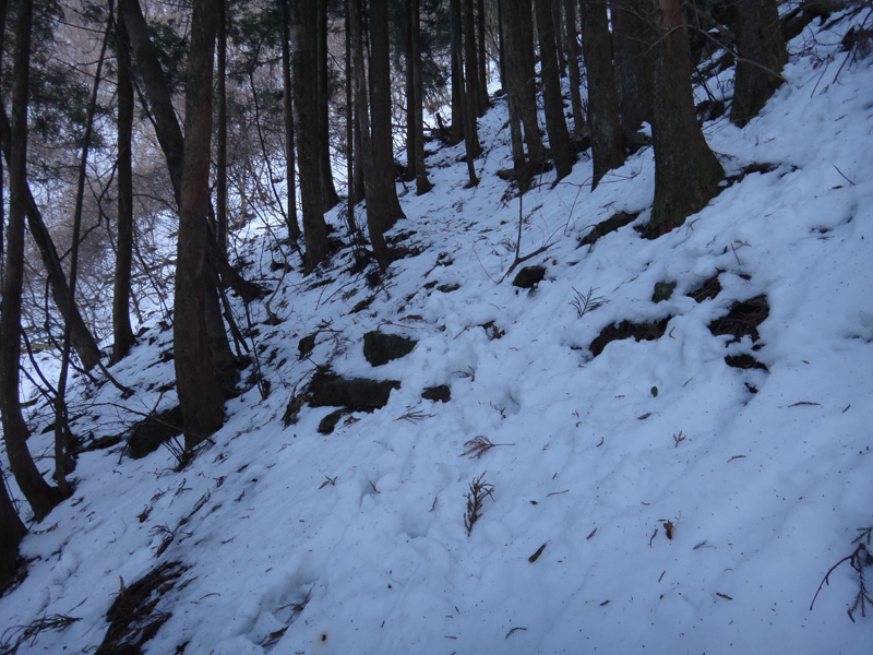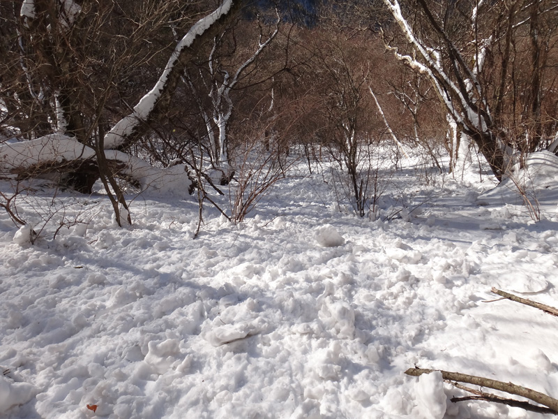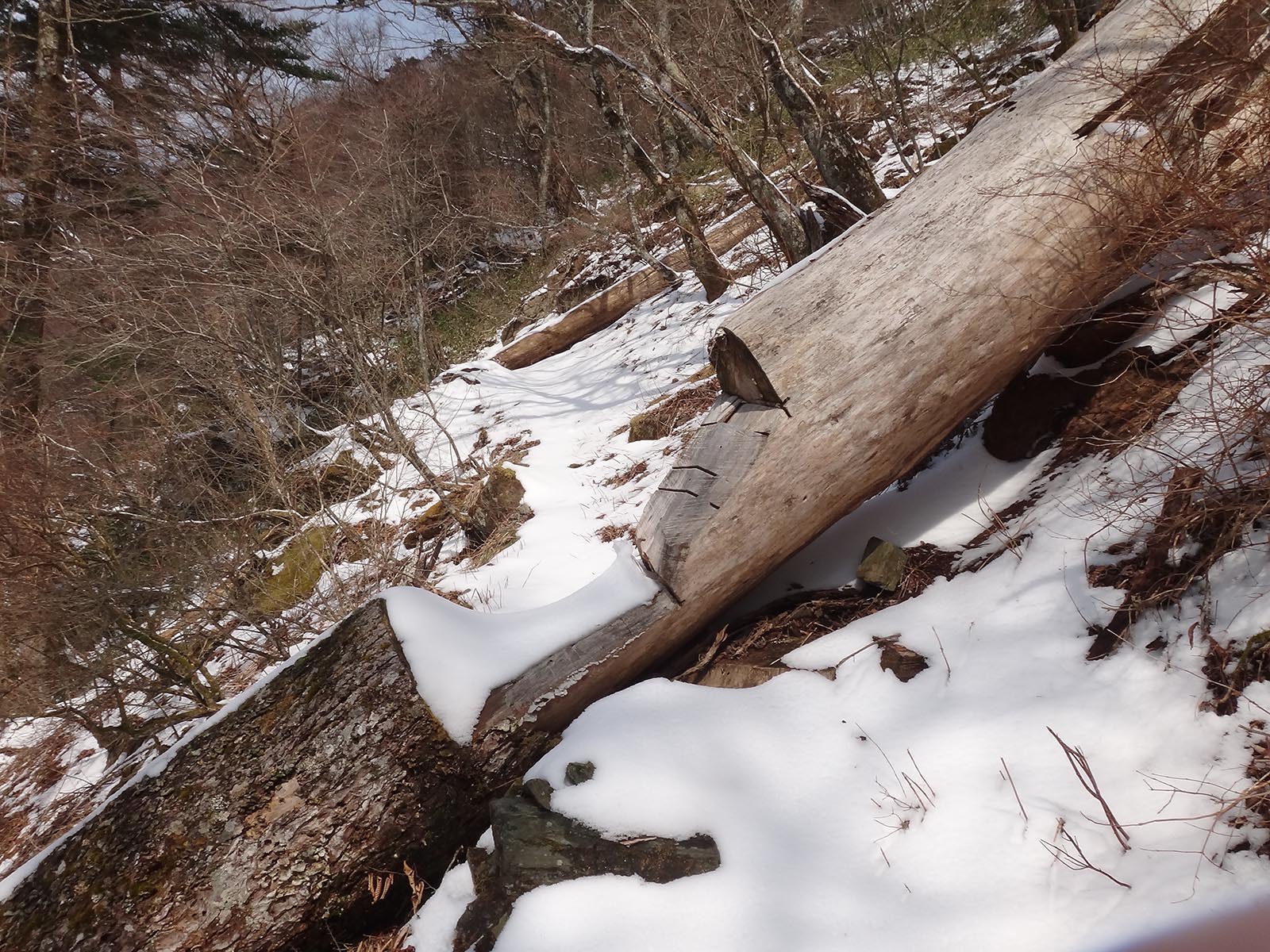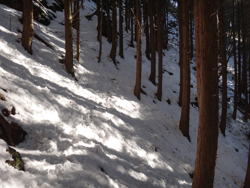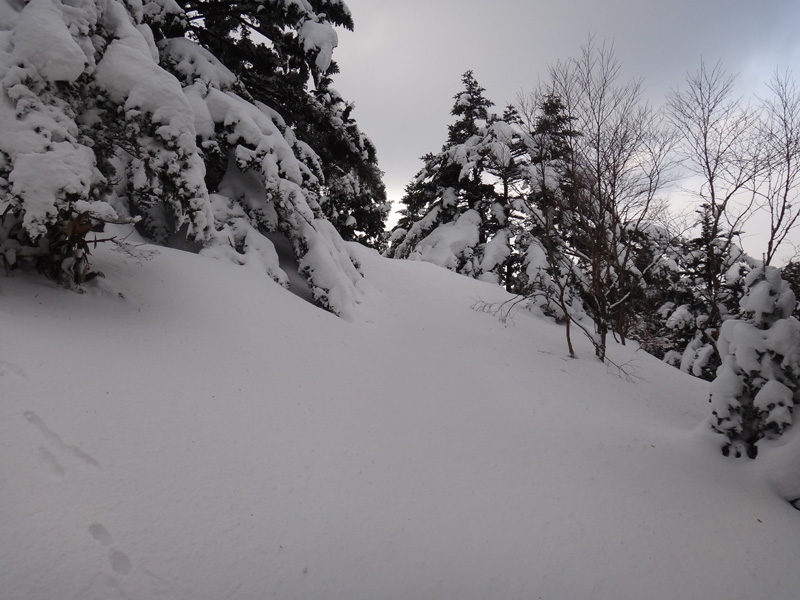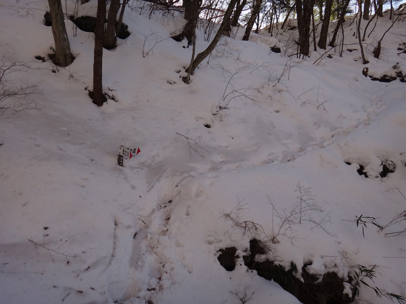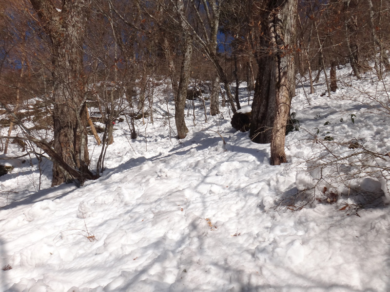 そしてメチャメチャ歩きにくい。 雪も通常の箇所で膝下くらい、夏の登山道を外れて背の低い樹木の中に入ってしまうと、腰くらいまで埋まってしまう。 なるべく夏の登山道を外さないように歩いているが、ルートファインディングが難しいな。 前日の人の足跡は、軽く雪崩れたような斜面で、すっかり消えてしまっている。