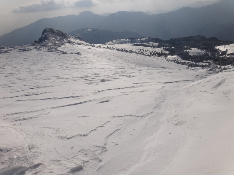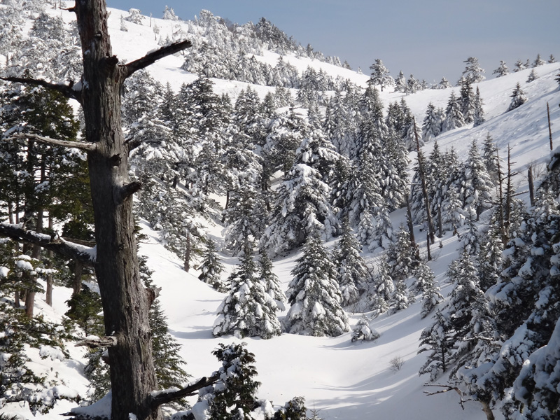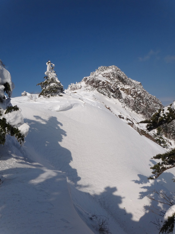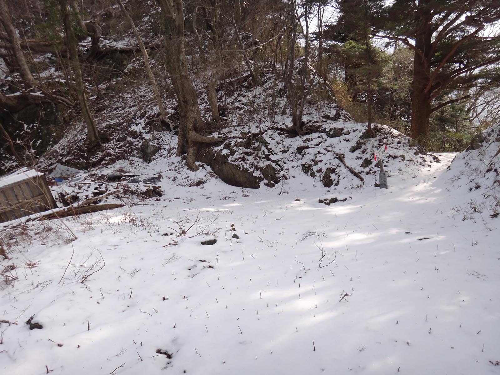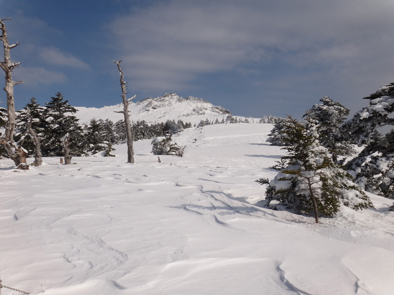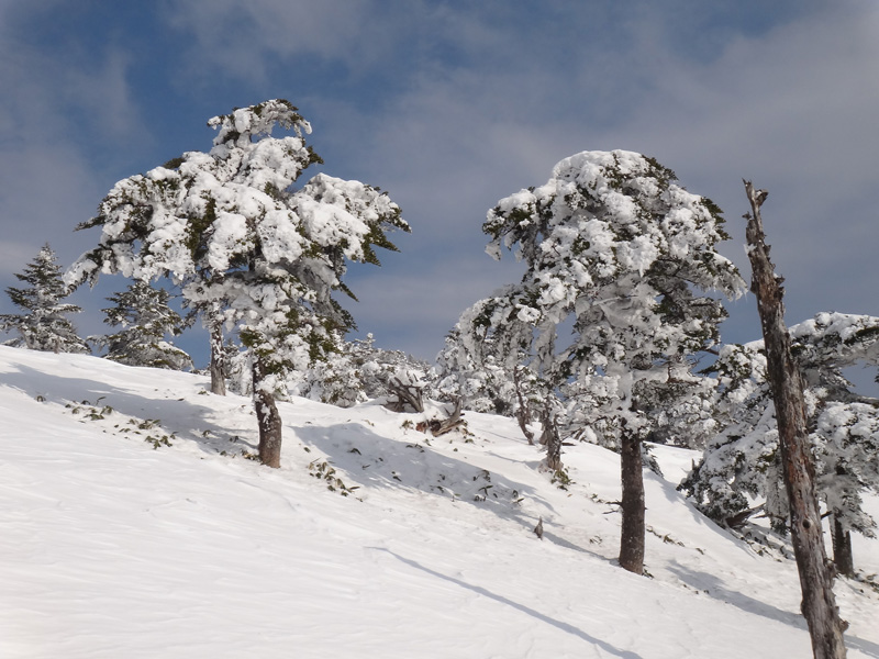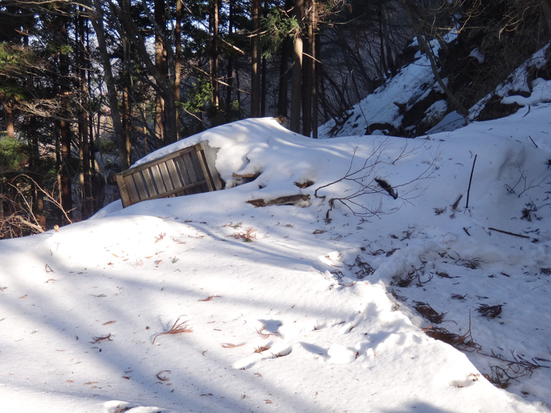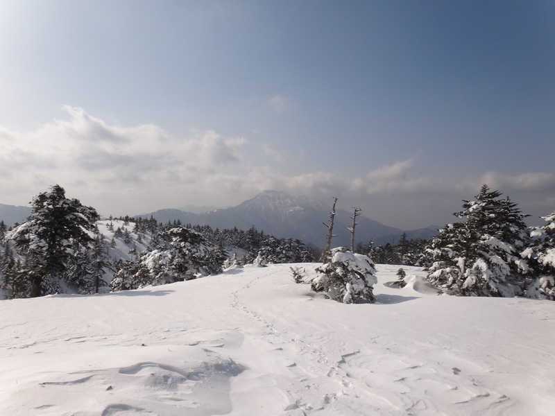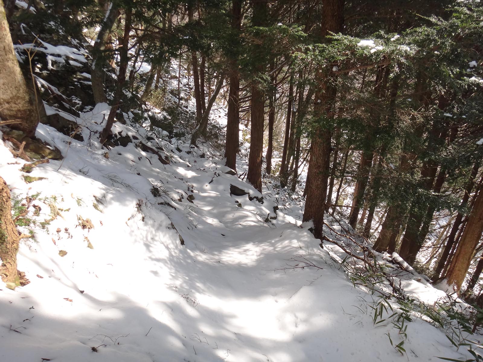 そしてメチャメチャ歩きにくい。 雪も通常の箇所で膝下くらい、夏の登山道を外れて背の低い樹木の中に入ってしまうと、腰くらいまで埋まってしまう。 なるべく夏の登山道を外さないように歩いているが、ルートファインディングが難しいな。 前日の人の足跡は、軽く雪崩れたような斜面で、すっかり消えてしまっている。
