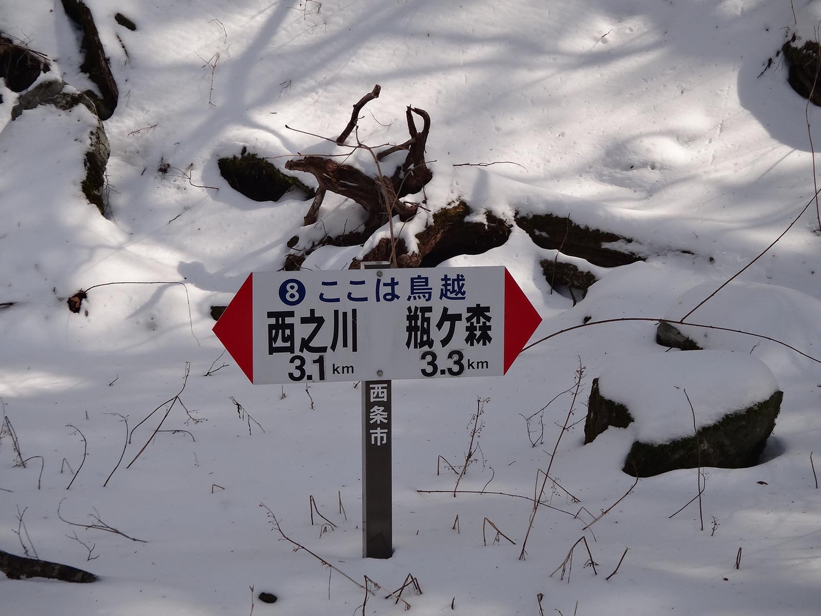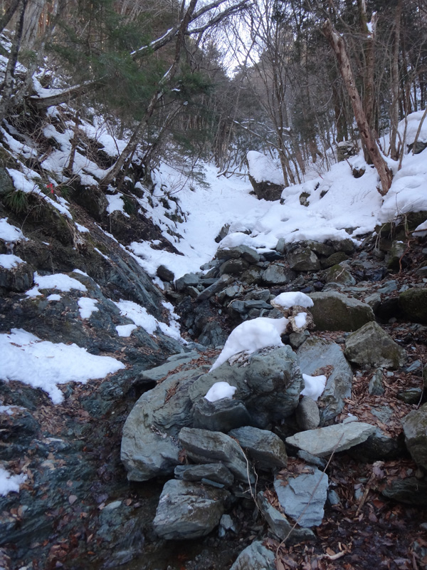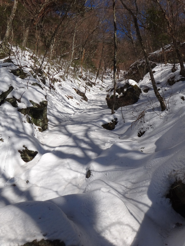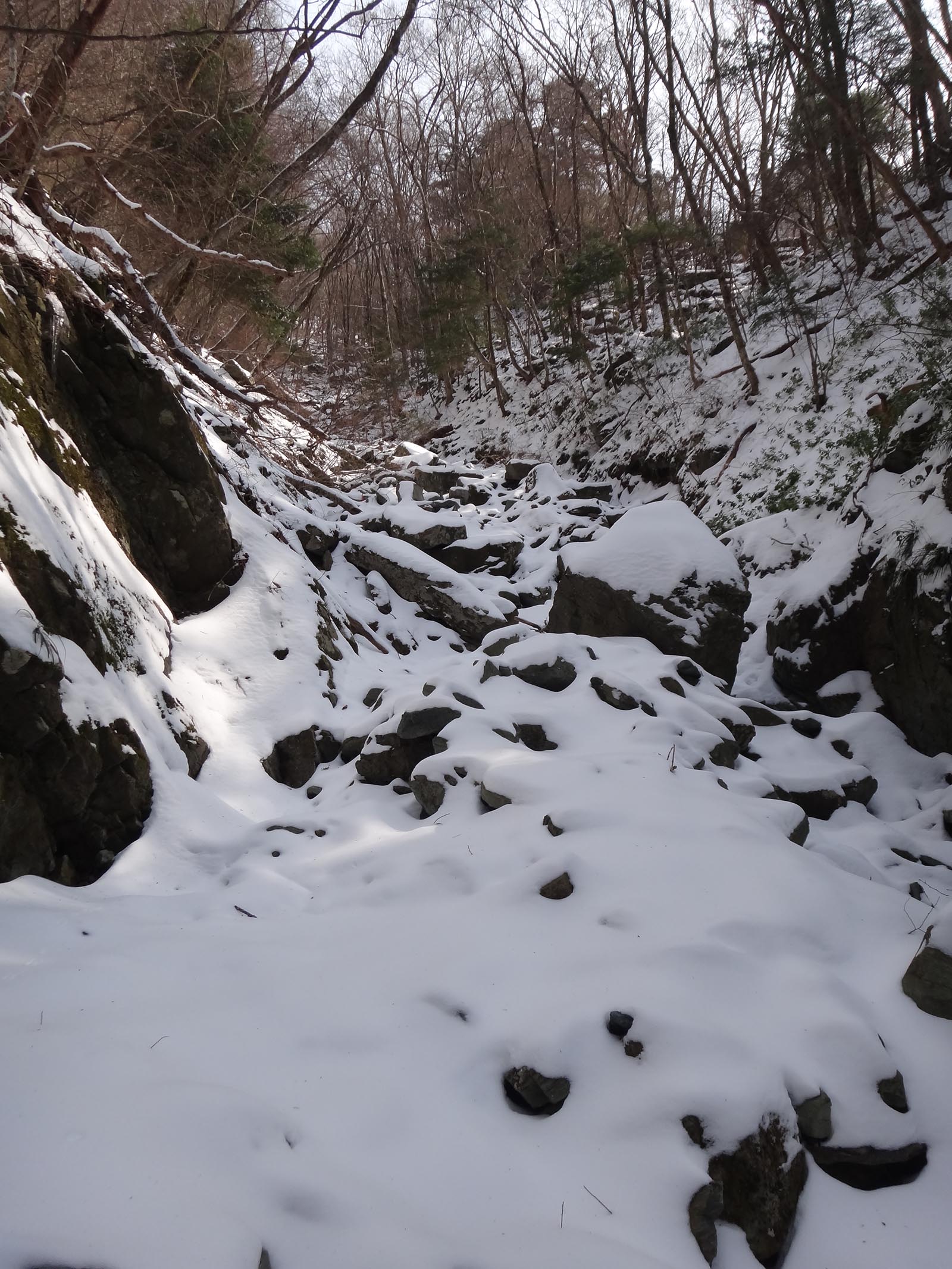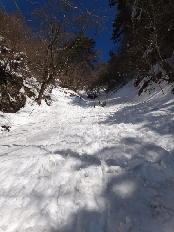 ここから先は、ずっと雪があるような感じの道だった。 山道を歩き、途中から枯れ沢に変わる。 枯れ沢は、結構雪が深くなっている場所があって、呼吸を荒げながら登っていく。 前日に歩いたらしき足跡ははっきり残っているので利用させてもらうが、固くて逆に歩きにくい場所もあった。 しばらく歩き、鳥越に到着。