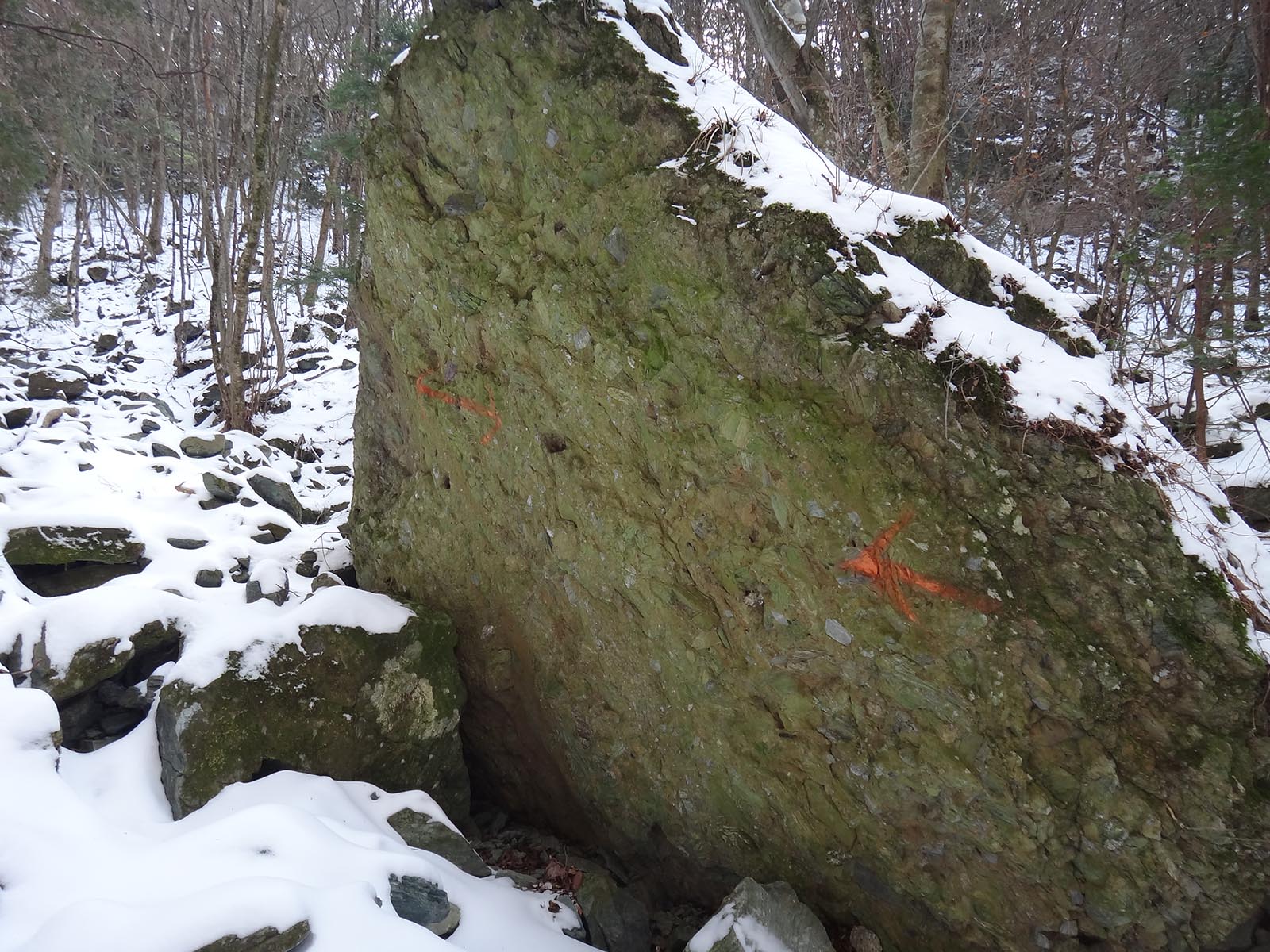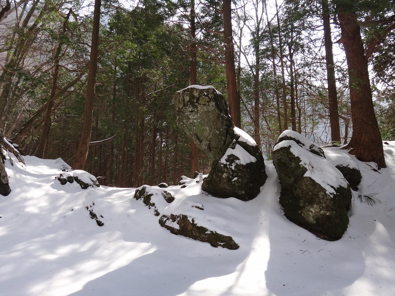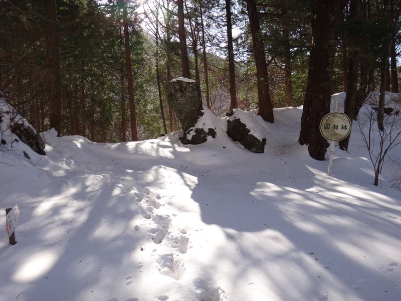 ここから先は、ずっと雪があるような感じの道だった。 山道を歩き、途中から枯れ沢に変わる。 枯れ沢は、結構雪が深くなっている場所があって、呼吸を荒げながら登っていく。 前日に歩いたらしき足跡ははっきり残っているので利用させてもらうが、固くて逆に歩きにくい場所もあった。 しばらく歩き、鳥越に到着。
