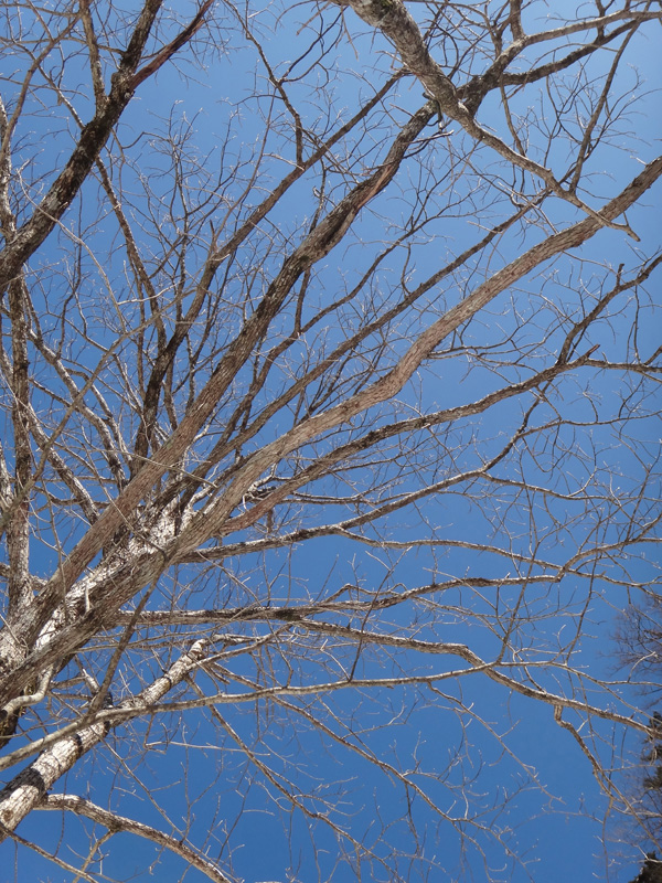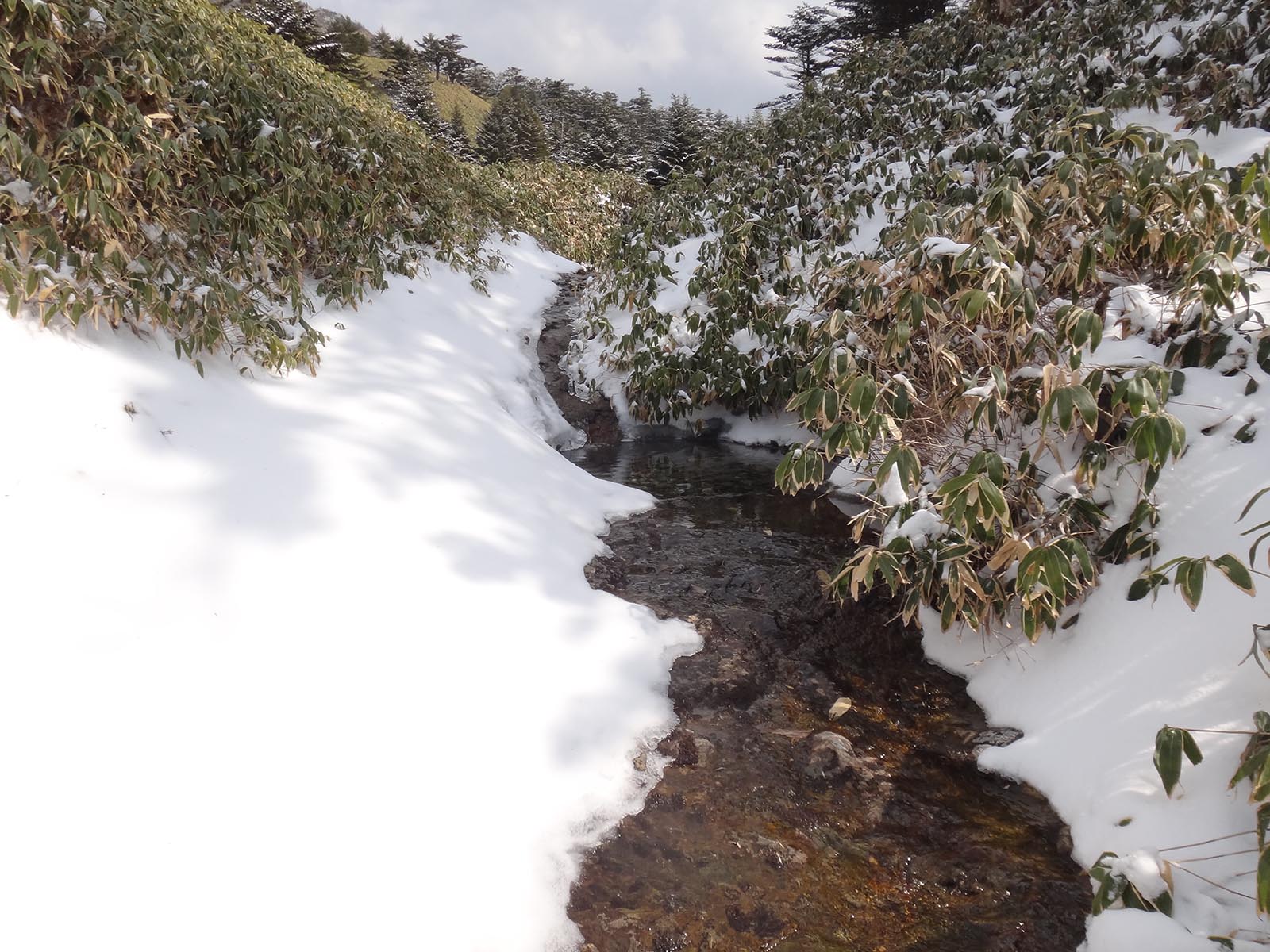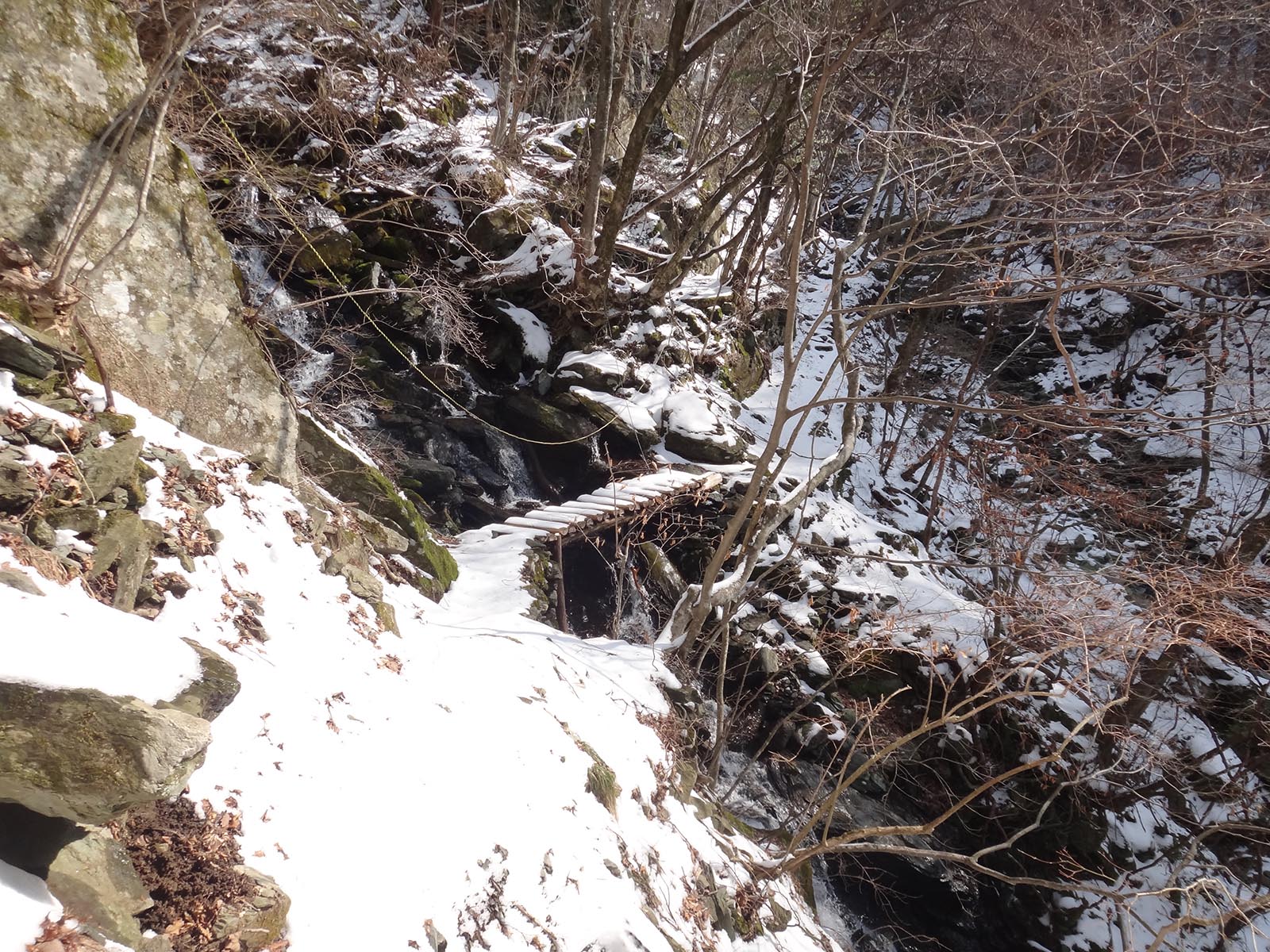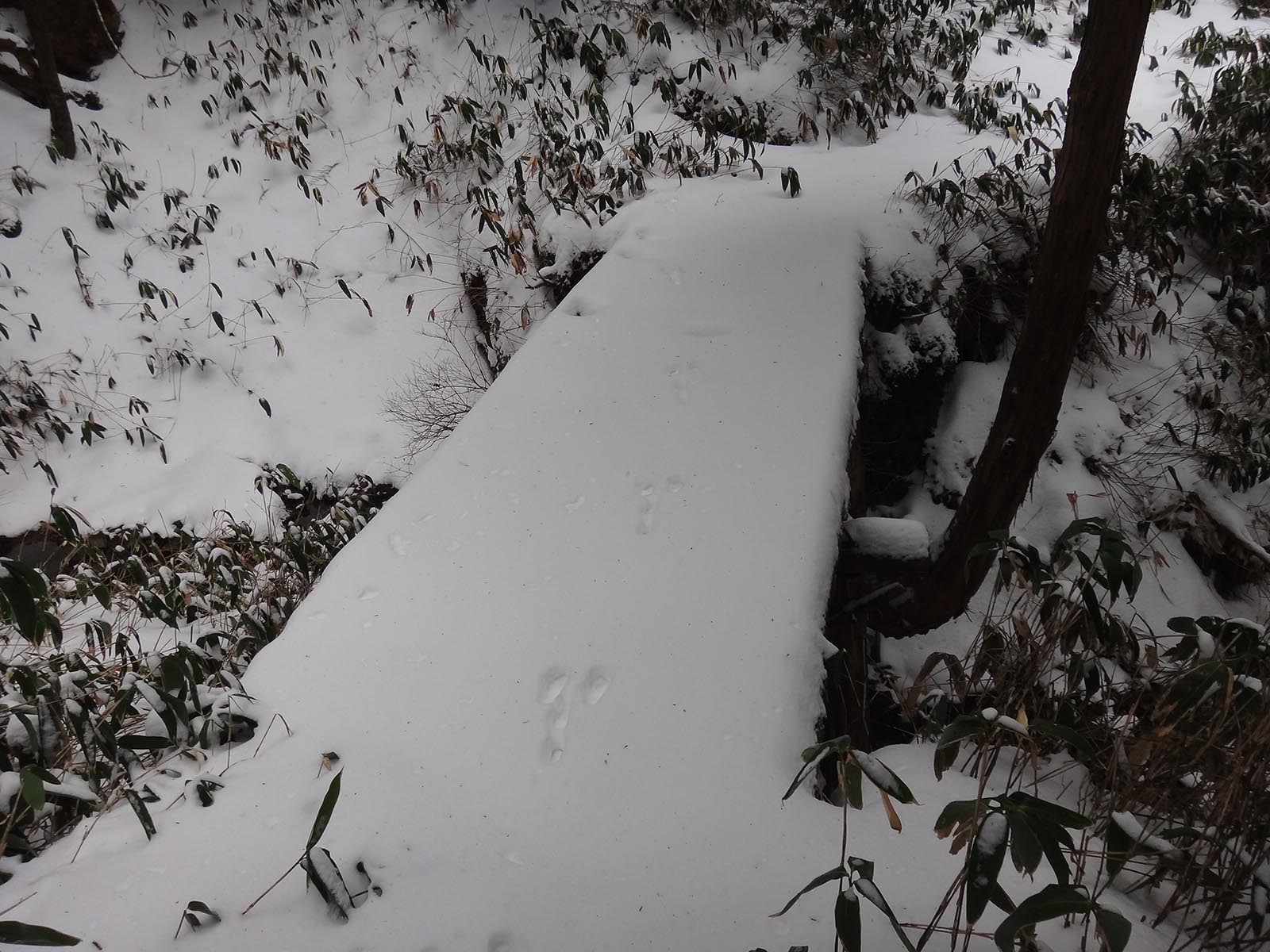 小屋前から樹林帯を通って瓶壺に行くのだけど、樹林帯にかかる橋は雪に覆われていて、雪の重みで垂れ下がった枝が邪魔で、渡りづらかった。