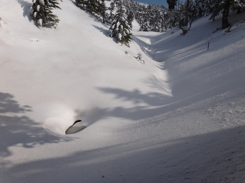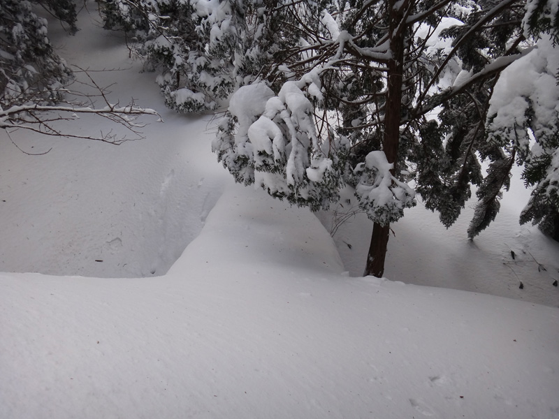 日当たりのいい斜面では、木々についている雪が落ちてきて、そのまま斜面を転がって行ったりして、軽く雪の斜面が崩れたような模様になっている箇所が多数あった。 この辺りになるとクラストしてなく、水分を含んでやわらかくなっている。