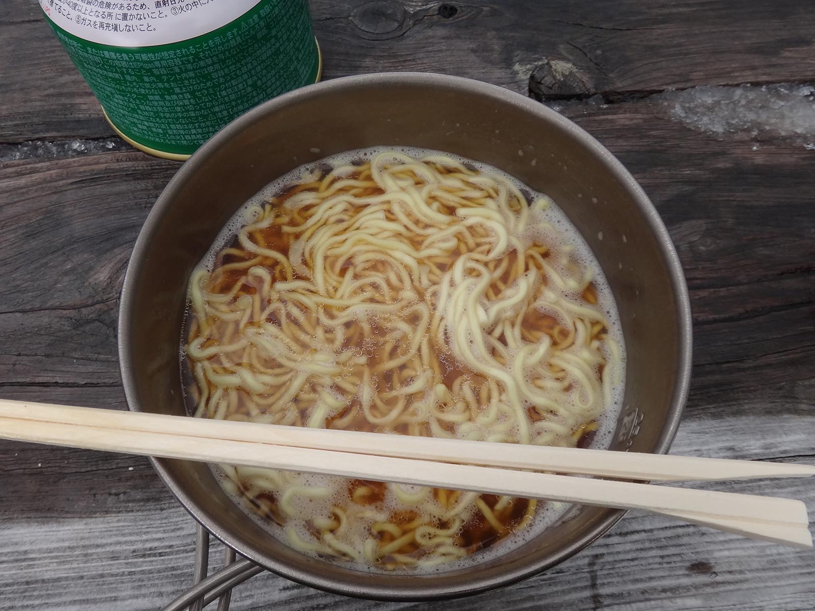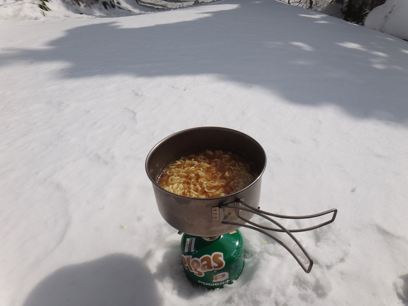 この辺りで、お昼にしようかな。 既におにぎり2つ食べてしまって、残る食料はラーメンしかない。 しかもかなりお腹が空いている。 風の当たらない場所を探して、休憩。 温かいラーメンを食べるが、体は全く冷えていないし、気温もマイナス数度だろうから、そんなに寒くもない。 もう13時過ぎているし、瓶ヶ森山頂まで、このペースだと、まだ1時間以上はかかるだろうから、あまりゆっくりしている時間もない。 ラーメンだけ流し込んで、男山を目指す。