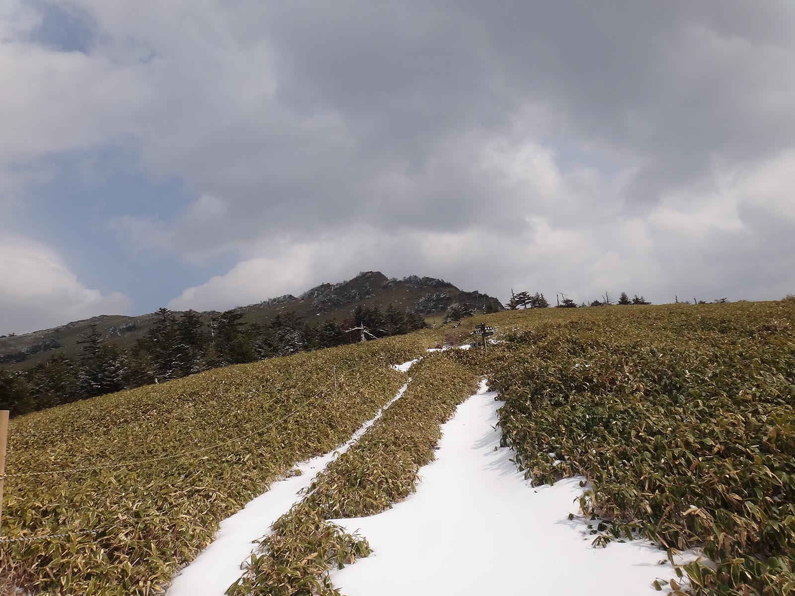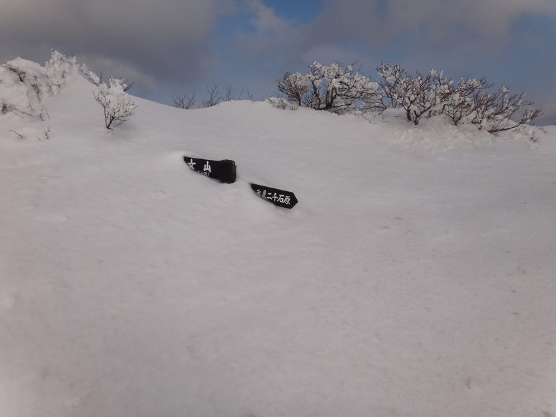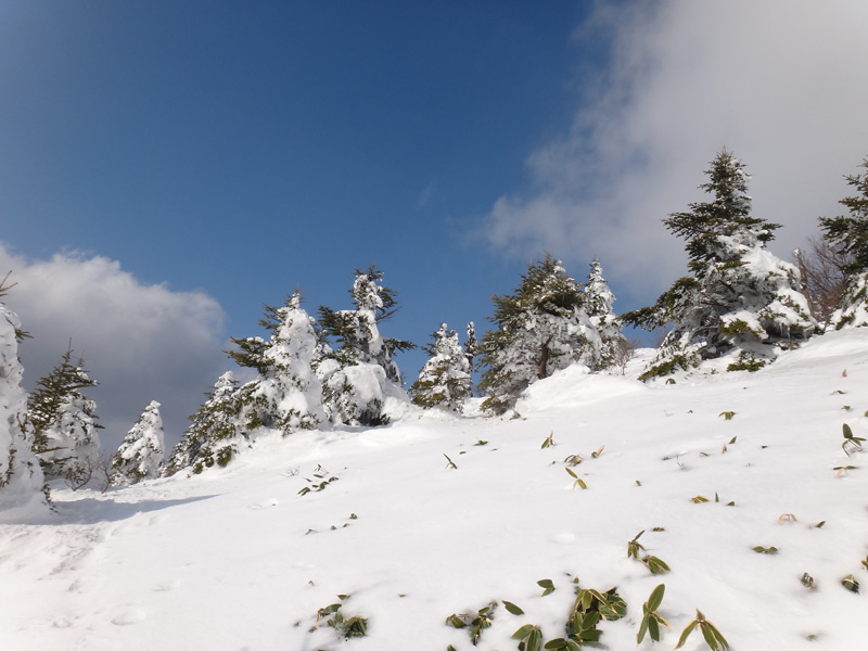 瓶壺から登山道に上がるのだけど、登山道が雪に覆われすぎてきつかった。 一歩踏み外すと笹地帯なので、腰まで埋もれる。 だが、登山道を歩いても、膝くらいまで埋まるときもあれば、雪が固まっていて全く埋まらない時もある。