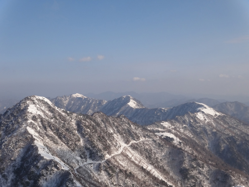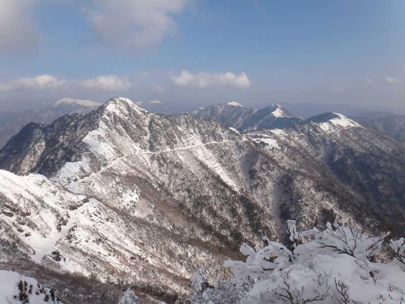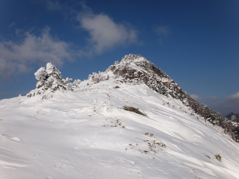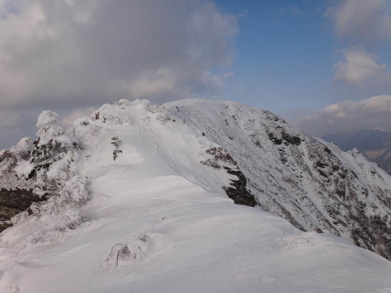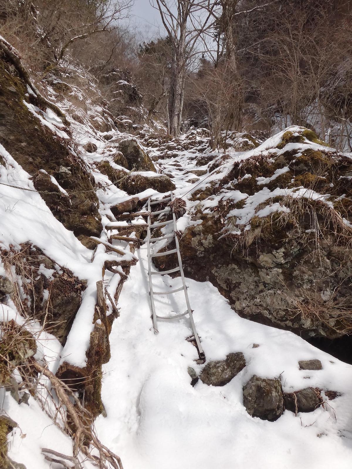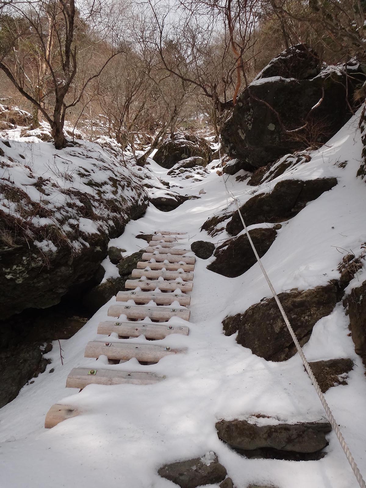 まだ雪は無いので、普通に歩いて行く。 だんだんと雪が出てきた。 十郎アレに新しい太いロープが設置されていた。 そして、そのロープを使わないと登れないほど斜面は崩落していた。 さて、ここから常住まで、グネグネと高度を上げていく。 一気に汗が噴き出してくる。 今日は暑い……