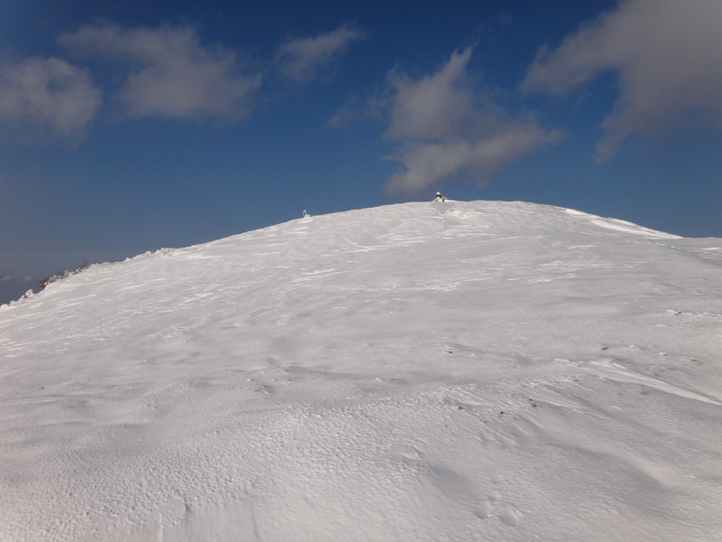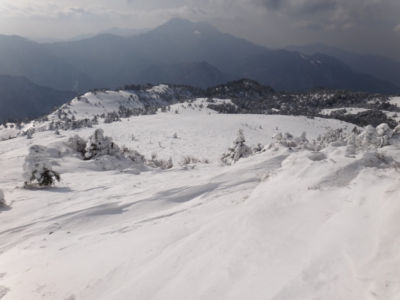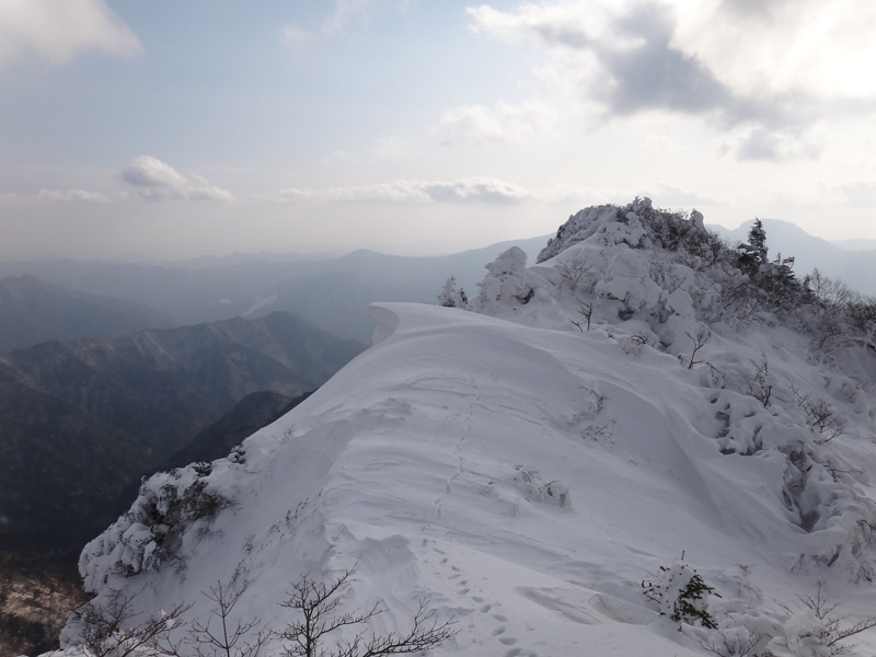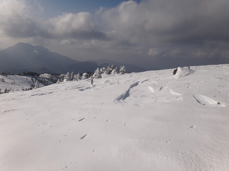 ここから瓶ヶ森山頂へ向けて歩いていくのだけど、どこが本来の登山道なのかさっぱりわからない。 あまり右側に行ってしまうと、崖で雪庇もあって危険なので、なるべく崖側にはいかないよう、かつ雪の固そうな場所を…… 目指す山頂は前に見えているので、適当にルートを考えつつ、歩いていく。