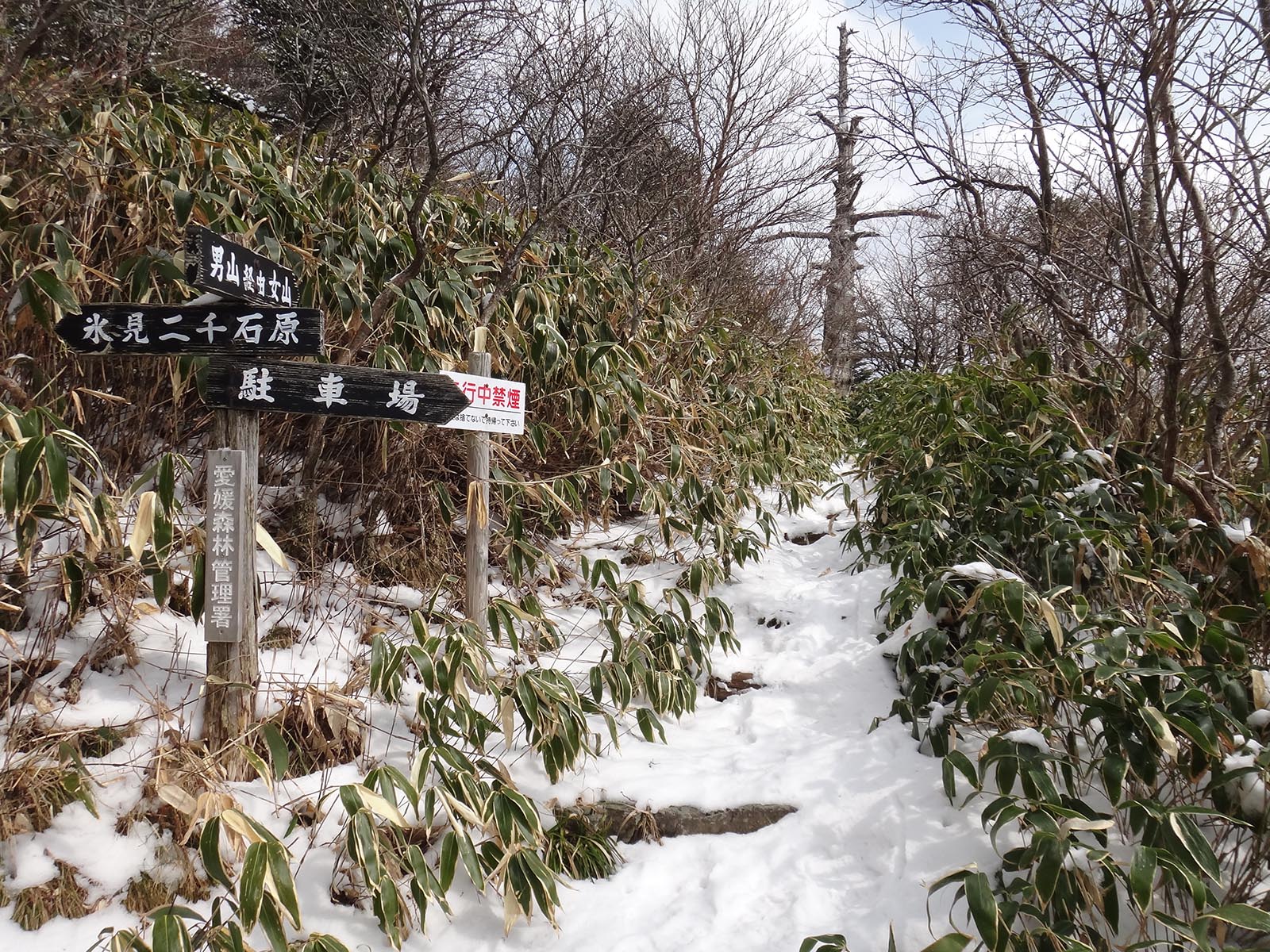 登山口から歩き始め、まずはグネグネと歩いて標高をあげていく。 いったん林道を横切って、ここから本格的な登山道に変わる。 この時点で、雪はほとんどない。 所々雪が出てくるのだけど、いったん融けて、また凍っていて、クラスト。