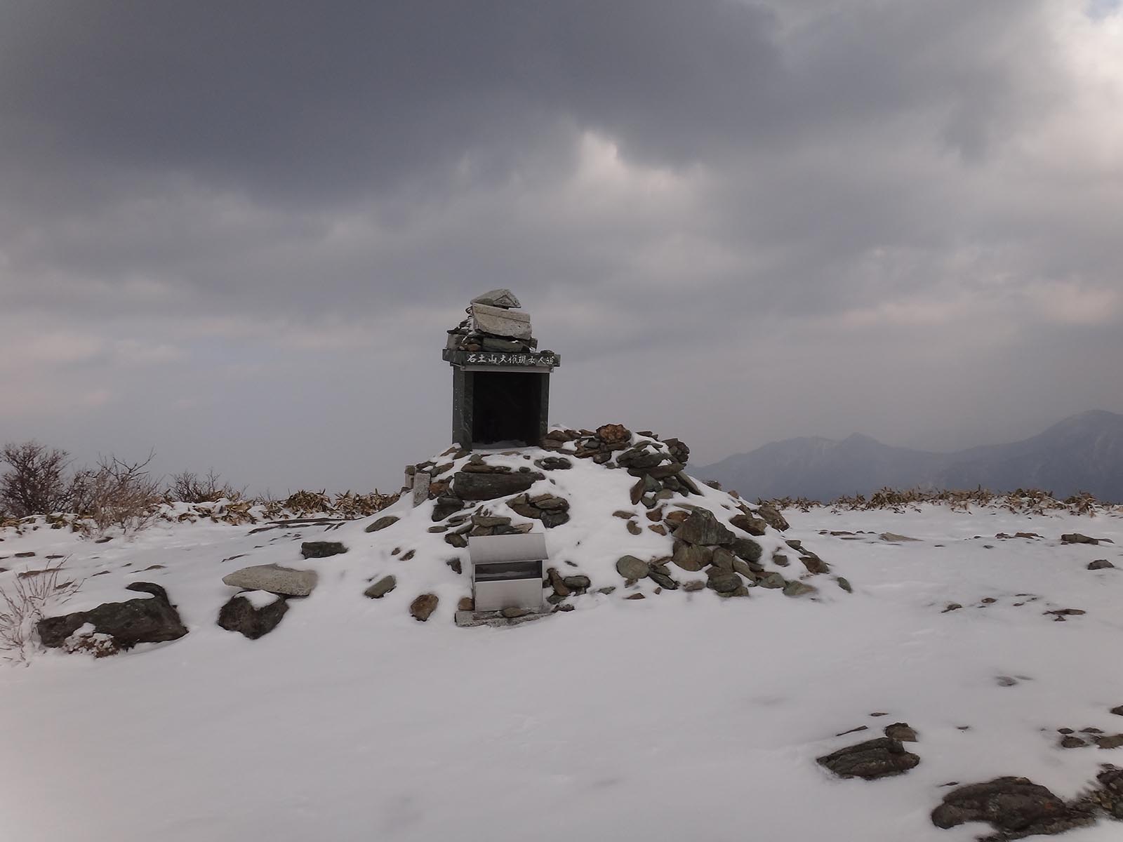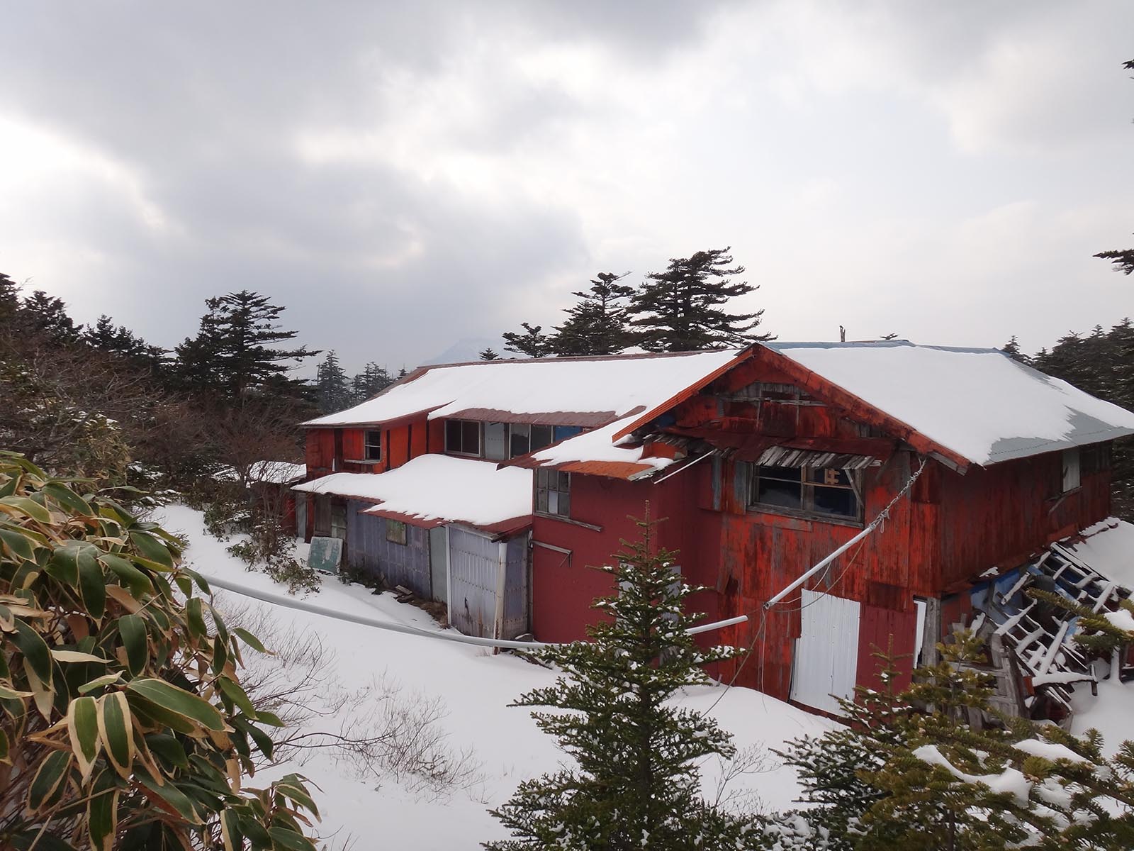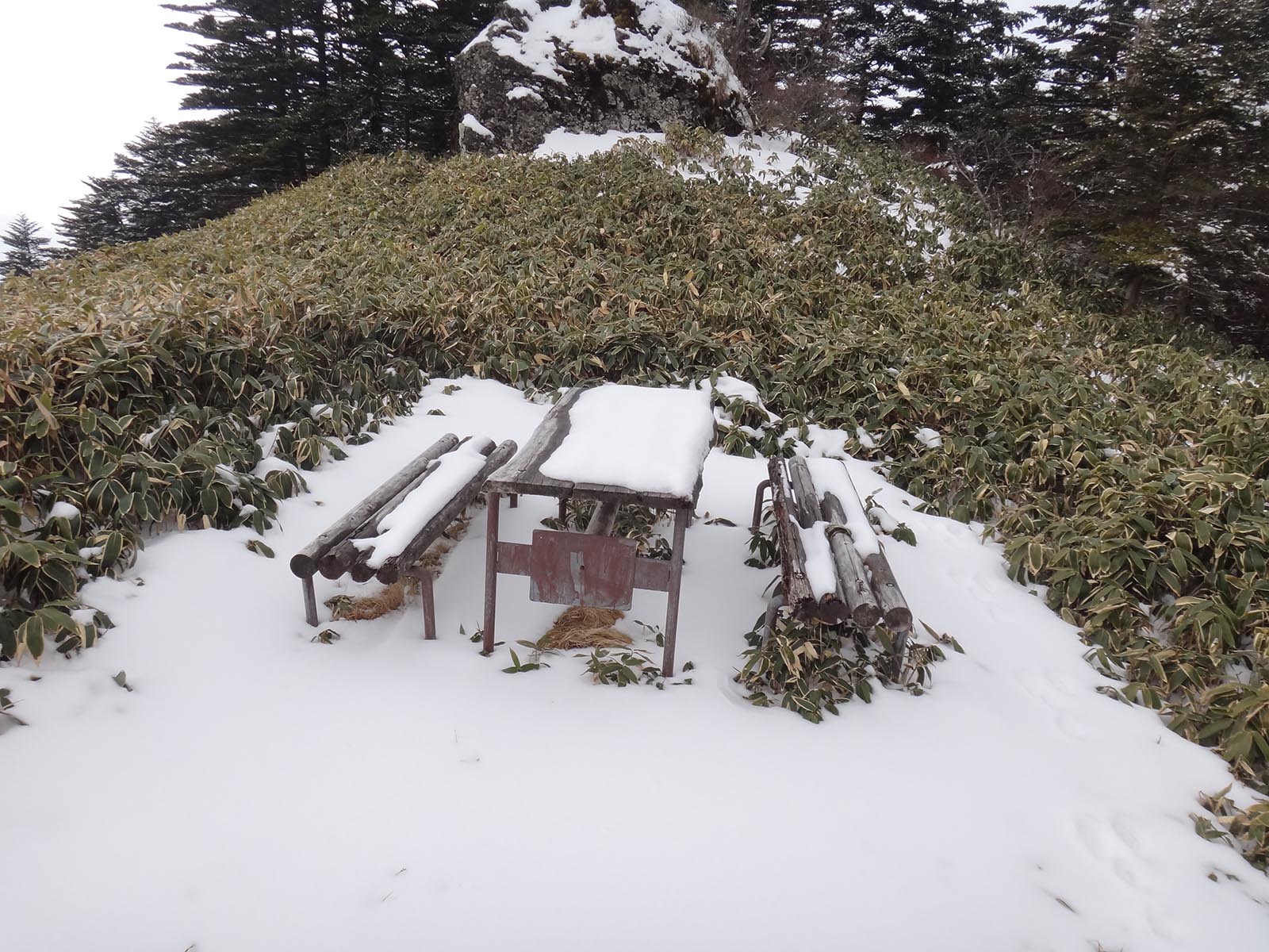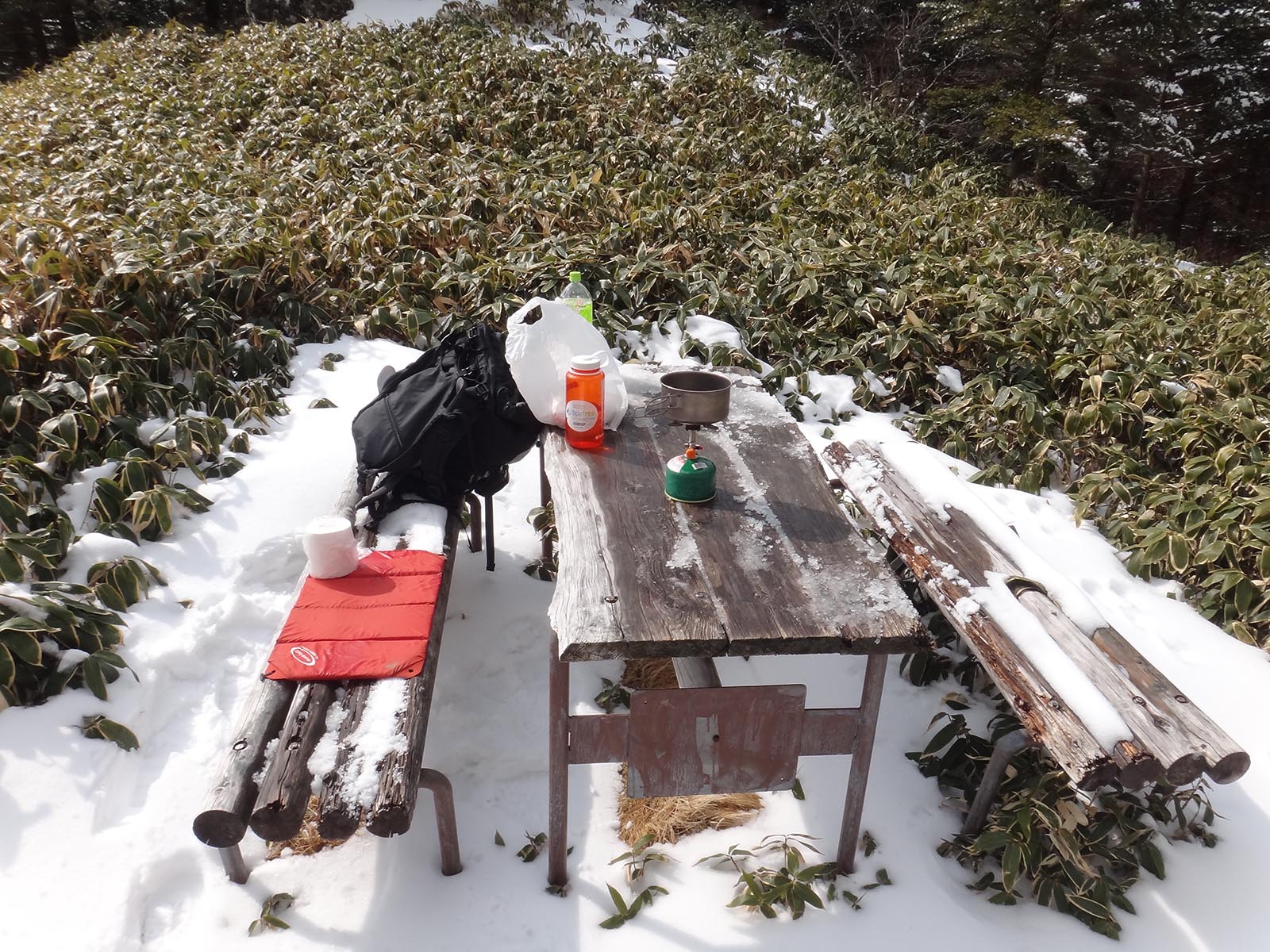そのまま瓶ヶ森を目指す。 上の方は風がけっこう吹いていた。 そして、瓶ヶ森山頂に到着。 ここは休憩するには風が避けられず寒いので、少しおりてから休憩しよう。 瓶ヶ森ヒュッテはボロボロでもう閉鎖されている?? その少し先に木のベンチとテーブルがあったので、そこで休憩することに。 休む場所があるのはありがたい。 雪の上で休むよりしっかりと休めるしな。 さっそくインスタントラーメンを作って、お茶を沸かしておにぎりも食べる。 気温はそれほど低くないはずなのに、全然お湯がわかなかった……