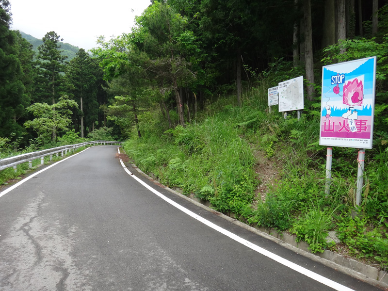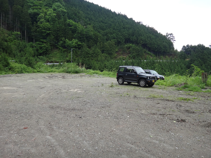 国道438号線、一宇集落を左折するのだけど、そこを直進する道へ。 この道通るの初めてだな。 けっこう細い道をどんどん上って行く。 途中から民家もほとんどなく…… 分岐から10kmほど走り、広い空き地に到着。 登山口がすぐ手前にあったからここに駐車していいのかな。 神社までも車で上れるみたいだけど、ここでいいか。