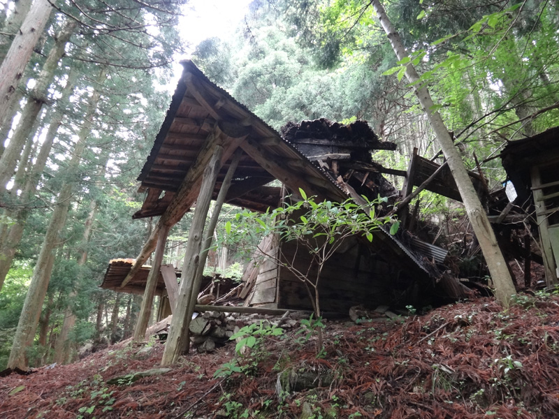 森の中を歩いていき、廃屋地帯を2か所通過し、登山口まで到着。
