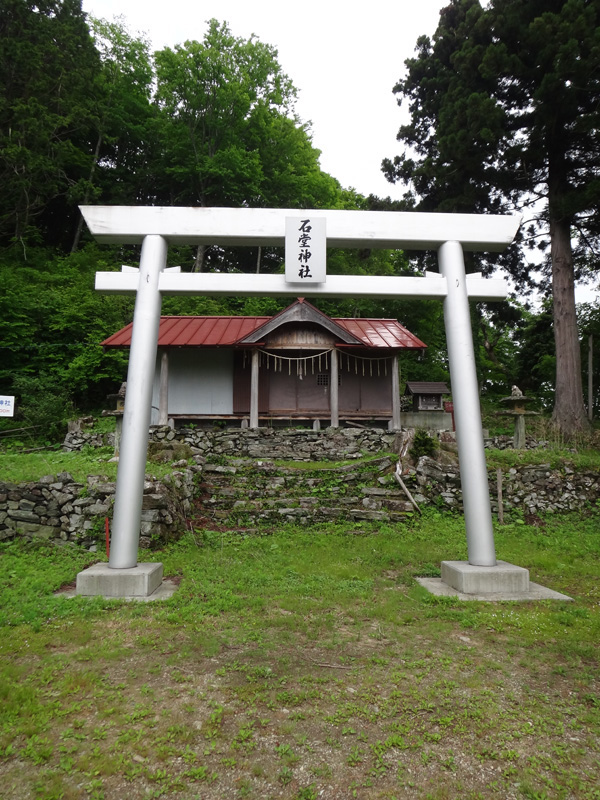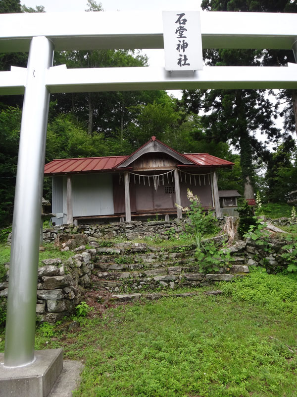 山の中に入ってすぐ、廃屋の脇を通過して行く。 廃屋にはトイレ完備!? ただ丸見えだな…… 登山道はけっこう急な傾斜で、杉の造林帯を登って行く。 しばらく歩き石堂神社に到着。