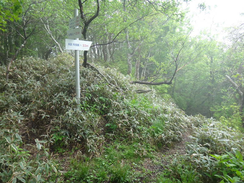 そろそろ休憩したいんだけどなぁ。 矢筈山への途中に、水場への分岐があったはず。 雨が直接当たらない、樹林帯で休憩したい。 笹も少ない方がよい。