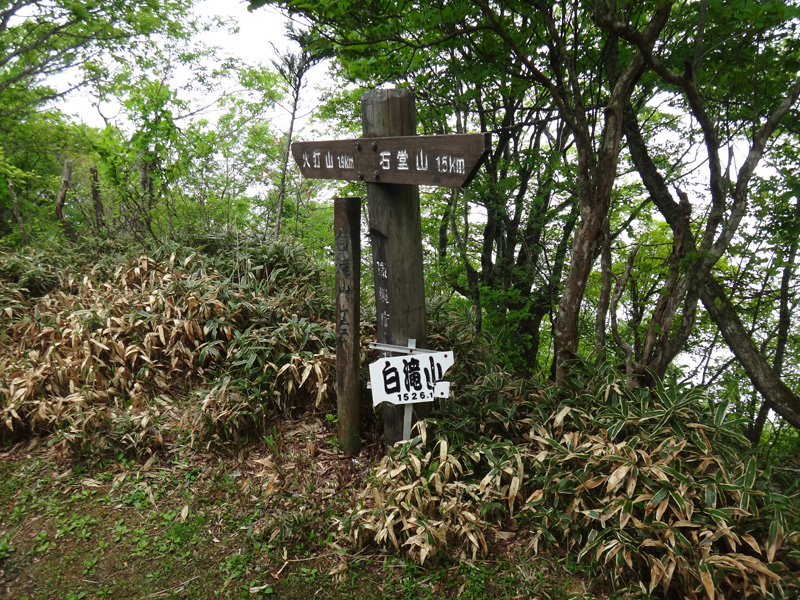 神社の脇から登山道に入る。 こちらは緩やかな登山道だった。 綺麗な森の中を歩く感じでどんどん進んで行く。 1kmほど歩いた地点くらいから傾斜がきつくなっていった。 しばらく歩き縦走路に合流。 ちょっと戻る形になるけど、白滝山がすぐそこなので、山頂だけ踏んでおこう。 ここから先は濡れた笹が腰くらいまであるのが見えたので、レインコートの下半身を装着。 白滝山まで100mなのでピストンし、石堂山に向かう。