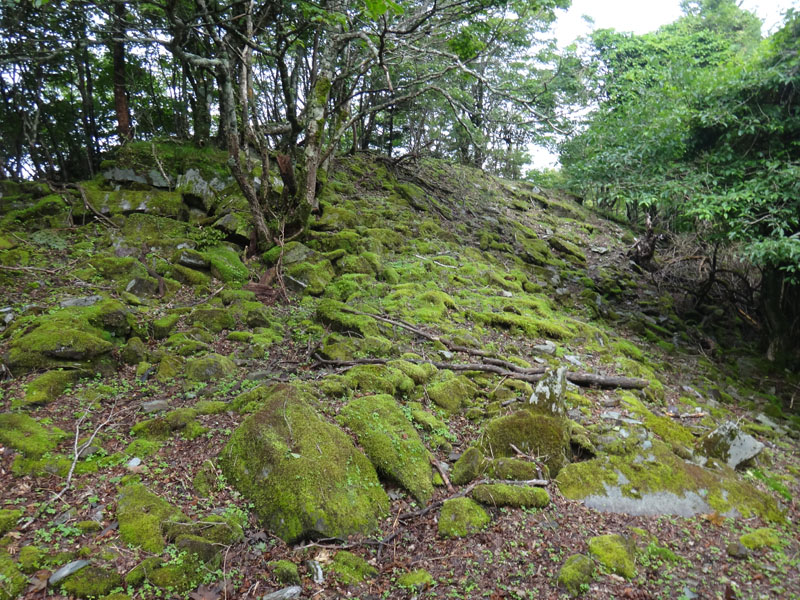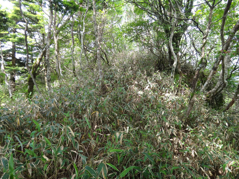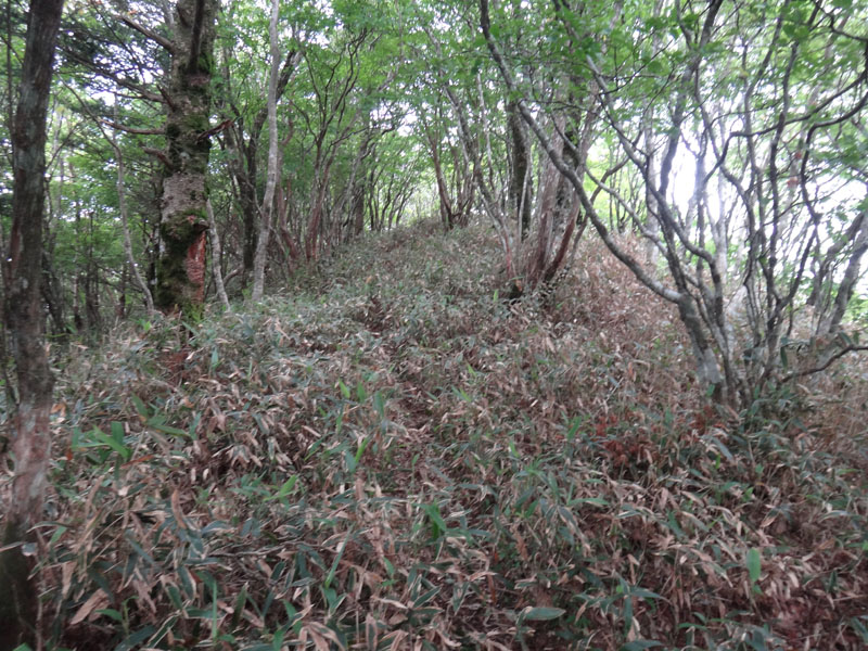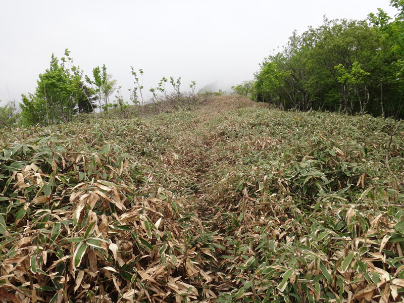 先ほどの分岐まで戻り、矢筈山を目指して歩いて行く。 道自体はおそらく大したことないのだけど、膝まで覆い茂笹と、その笹につく朝露で下半身はビショビショ。 そんな道を歩いて行くので、かなり心が辛い。