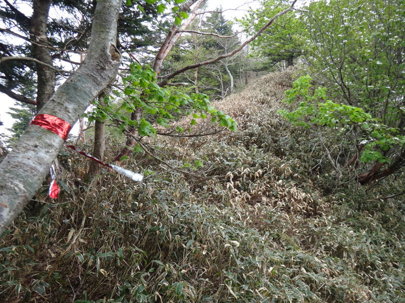 薄いほうの赤テープの道を進んでみるか。 こっちは傾斜がけっこう急で、所々赤テープやピンクテープが巻きつけてある。