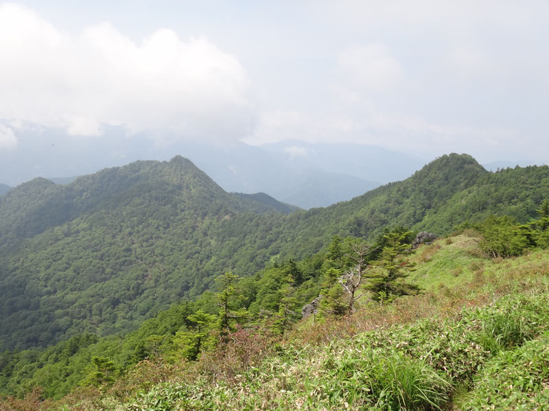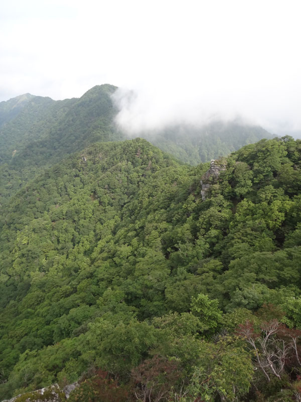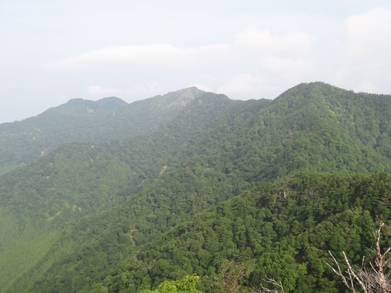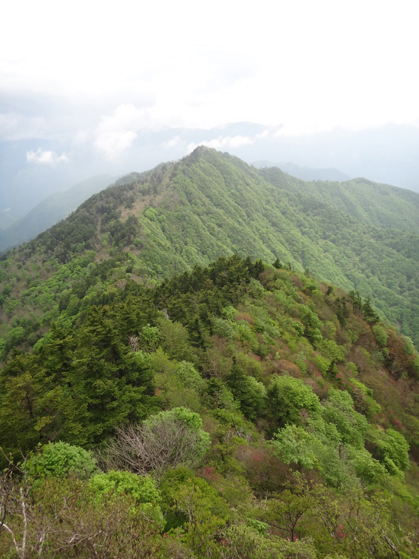 黒笠山から、矢筈山がきれいに見える。 こうやって見ると、まだ200m以上の標高差があるんだな。 黒笠山⇔矢筈山の悪路は、4年くらい前に一度だけ歩いたことがあるが、その時は、あまり悪路と感じなかった。 が、今回はどうだろうか? 道も全然覚えていないや。