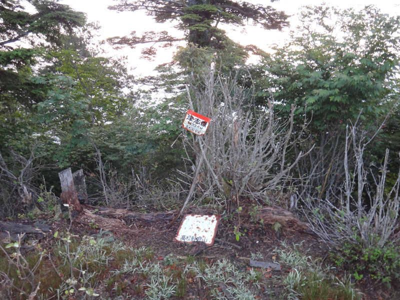 ピーク付近の岩場を西側から巻くような感じで歩き、木の標のあるところまでやってきた。 ここがピークなので、ここから先は下る。 この下り道はめちゃめちゃ印象に残っている。 トラヴァースする箇所があるのだけど、足元が崩れるので何かにつかまりながら歩かなくてはならない。 だが掴むものが植物しかない。 木は生えておらず、雑草を掴むのだけど、掴む対象となるのが、アザミ。 アザミの茎や葉にはとげがある。 痛みに耐えながらトラヴァースした思い出が……