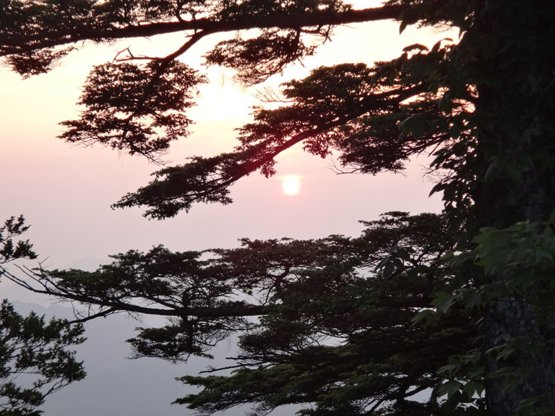 ツェルトを撤収して、もう一度津志嶽山頂に向かう。 木々の間から朝日が綺麗に見える。 すがすがしい朝だ。