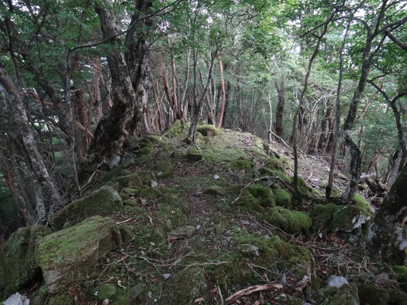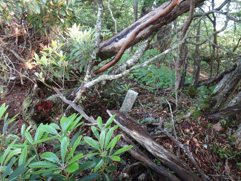 歩くこと15分ほど。 さっきの看板で750mとなっていたので、そろそろ着いてもいい頃だなぁ…… しかし山頂は見えない。 右側は谷。 左側は斜面になっている。 そのまましばらく進んでいくが、突然道が消えた。 明らかに踏み後がない。 50mほど歩くと、左側の斜面の上まで行けそうなので歩いて行ってみるが、そこにも道は無い。 これは…… 7月の寒峰を思い出す……