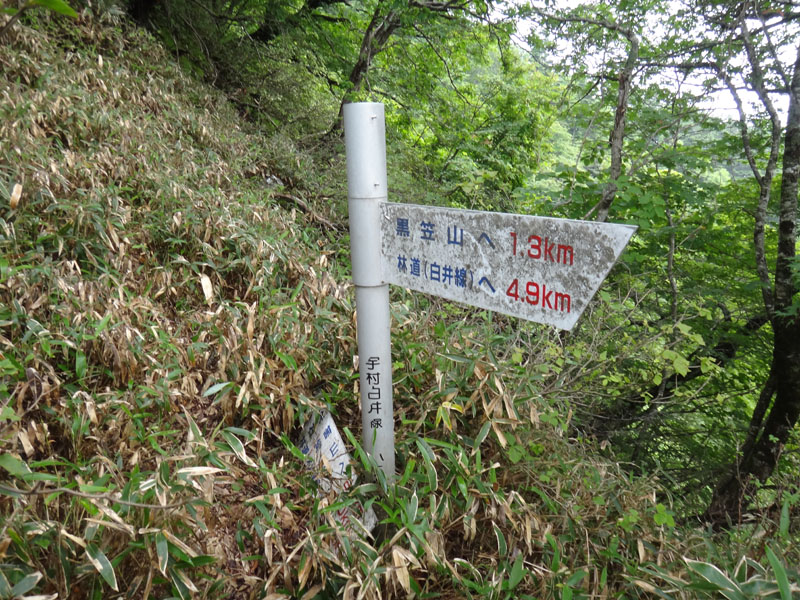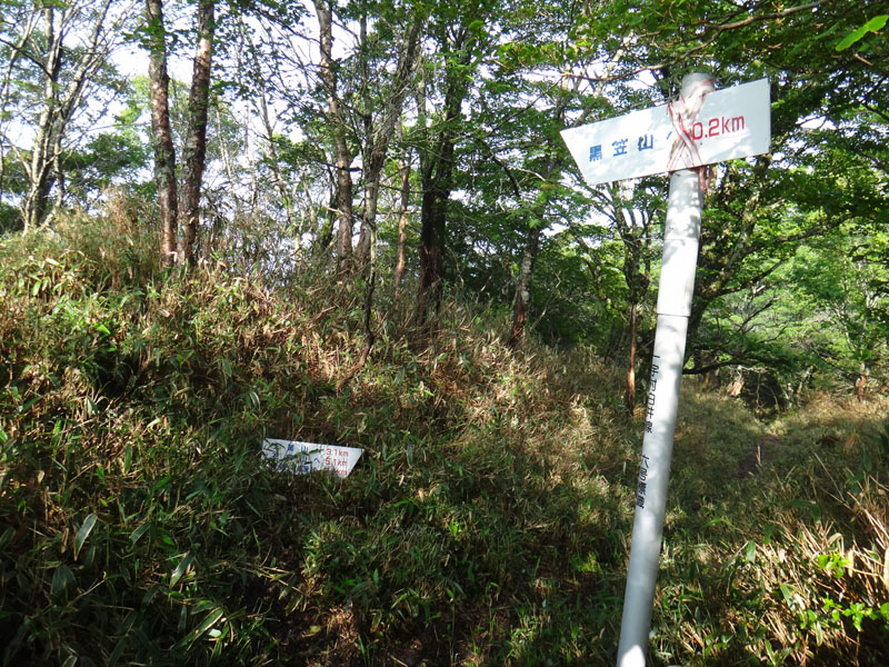 黒笠山に向かって歩いて行く。 気が付いたら、黒笠山まで0.2km、矢筈山まで3kmの分岐の看板のところまでたどり着いていた。 数百メートル手前で、白井方面からの登山道と合流してるはずなのだけど、合流したことに全く気付かなかった。 黒笠山はまだまだ先だと思っていたのに、急にあと200mと言われたらテンションが上がる。