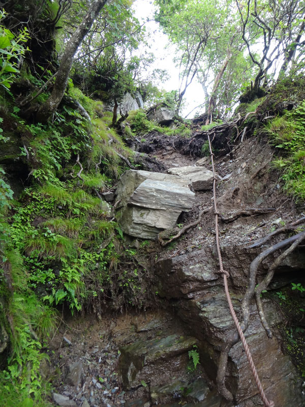 所々、木の階段が整備されているのだが、古くコケが生えている+雨で濡れているのでメチャメチャ滑る。 転倒しないように注意しながら歩く。