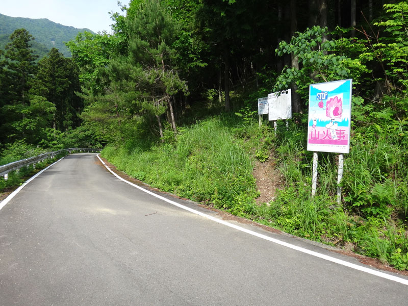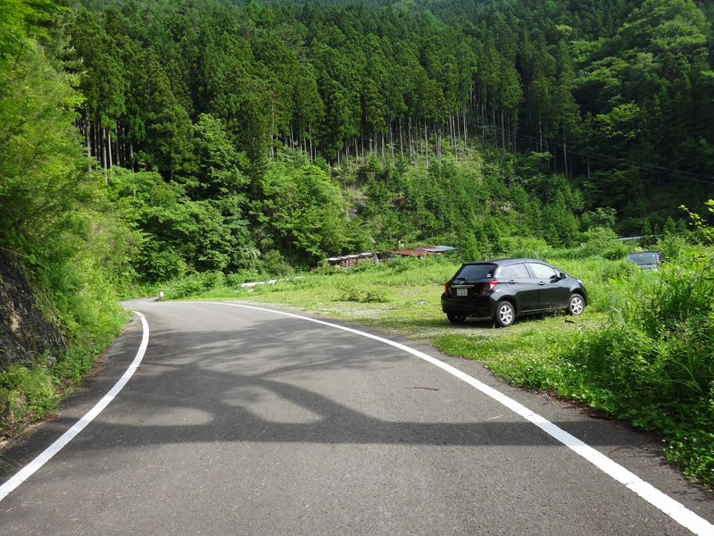 国道438号線、一宇集落を左折するのだけど、そこを直進する道へ。 この道通るの初めてだな。 けっこう細い道をどんどん上って行く。 途中から民家もほとんどなく…… 分岐から10kmほど走り、広い空き地に到着。 登山口がすぐ手前にあったからここに駐車していいのかな。 神社までも車で上れるみたいだけど、ここでいいか。