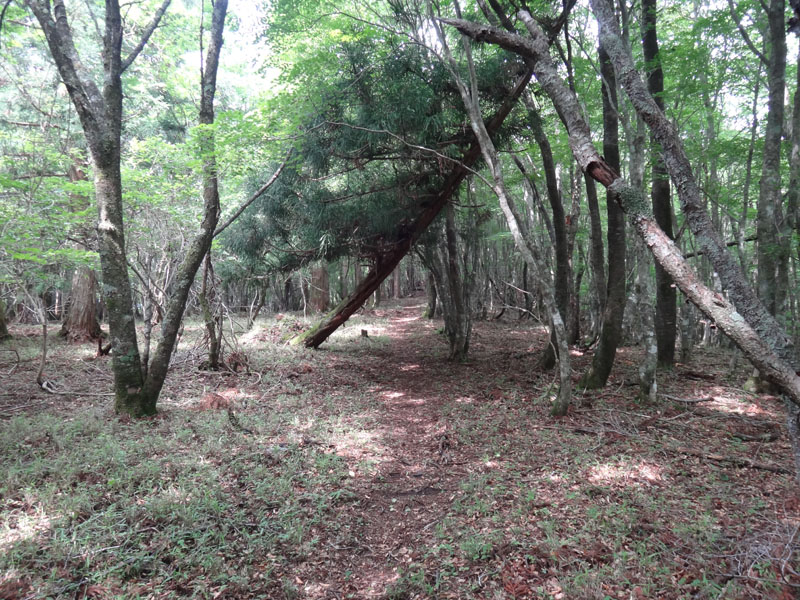 登山口から山に入って歩いていく。 すぐに廃屋があるのだが、以前来たときはトイレなどが残っていたのだが、今は完全倒壊していた。 樹林帯の道をどんどんと登っていく。 記憶以上に傾斜が急だった。 木々に覆われているので直射日光はないのでそれほど暑さは感じなかった。