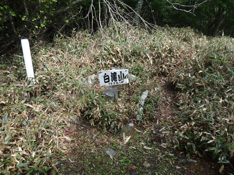 とりあえず白滝山がすぐそこなので、山頂だけ踏んでおこう。 笹に覆われた登山道を歩き白滝山に到着。 木々に覆われてまったく景色が見えない。 さぁ、分岐まで戻って石堂山に行こう。