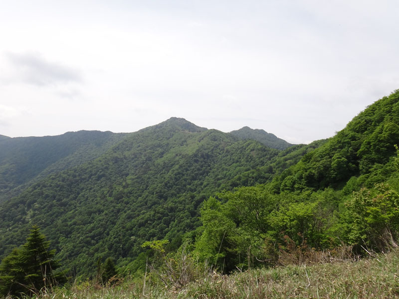 ここから落合峠までが意外に距離がある。 眼下に県道44号線が目に入ってくるのだが、なかなか落合峠にたどり着かない。 ときどき見える、三嶺や天狗塚は美しい。