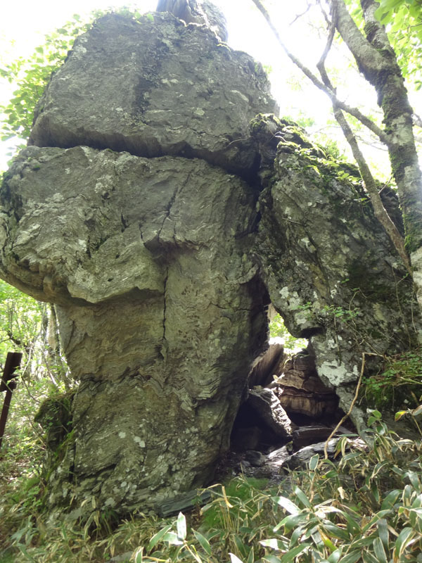 ここからは樹林帯を抜け、笹に覆われた登山道を歩いていく。 軽いアップダウンが何回かあり、素晴らしい石の塔を通過したら、すぐに石堂山山頂に到着。