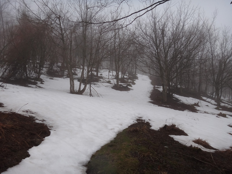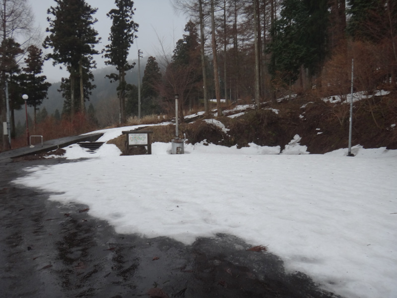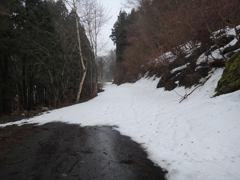 風呂塔、思っていたより雪があるかも。 積雪自体は20cmくらいで、雨が降ってるので水分含んで、めちゃめちゃ歩きにくいのだけど。