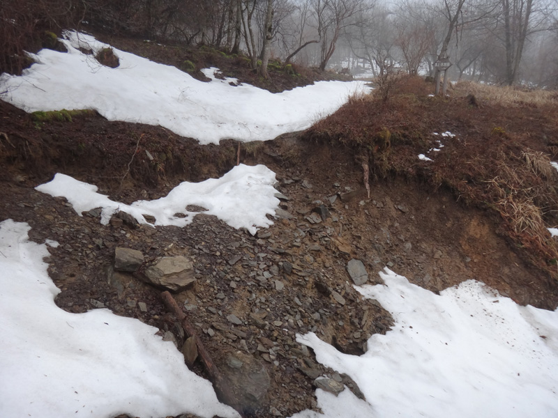 ファミリー向けの風呂塔までのコース、途中、7mくらい崩れている箇所があった。 冬の間に崩れたのだろうか。 雪の中、そこだけ泥だらけになり通過。