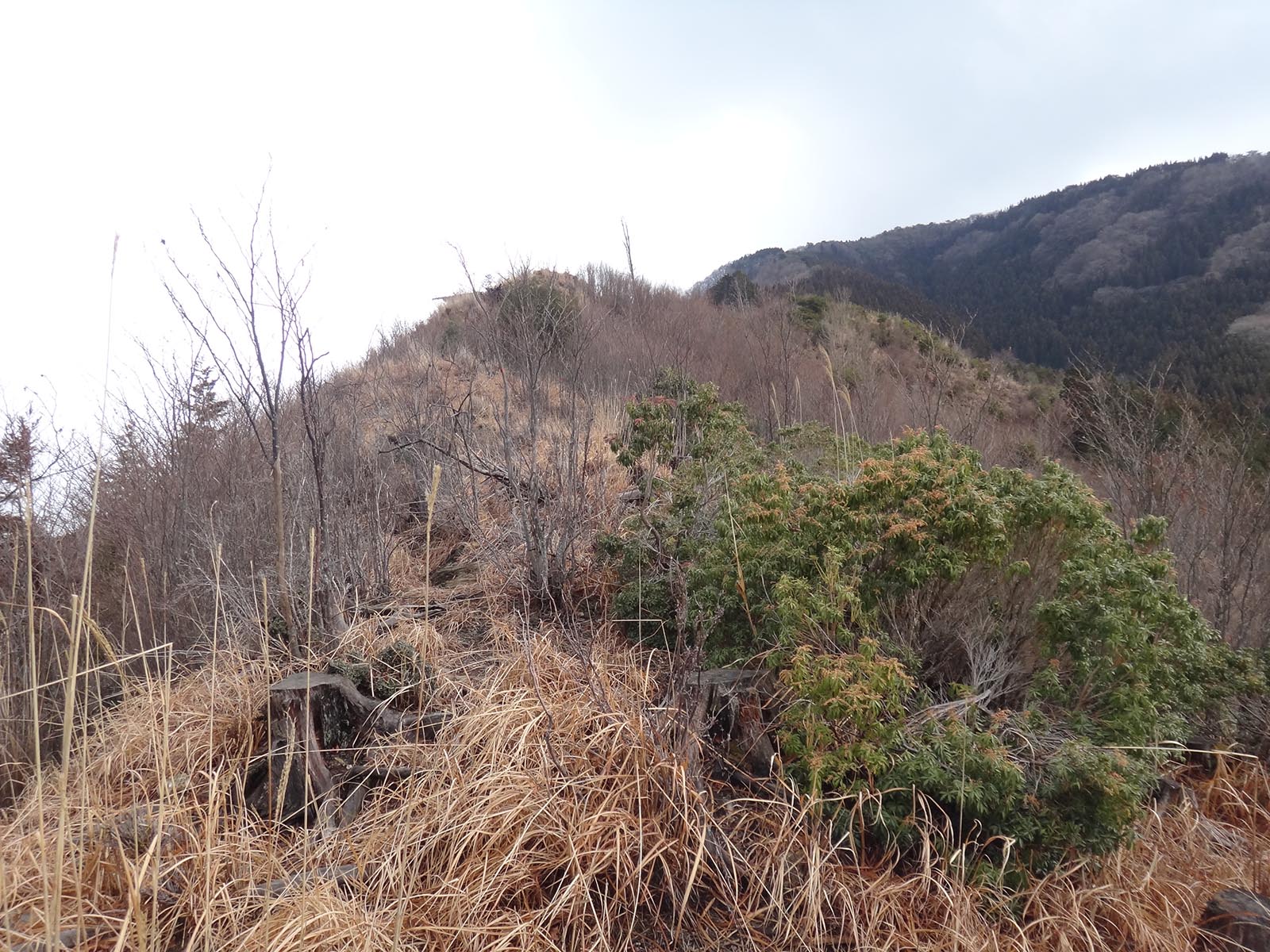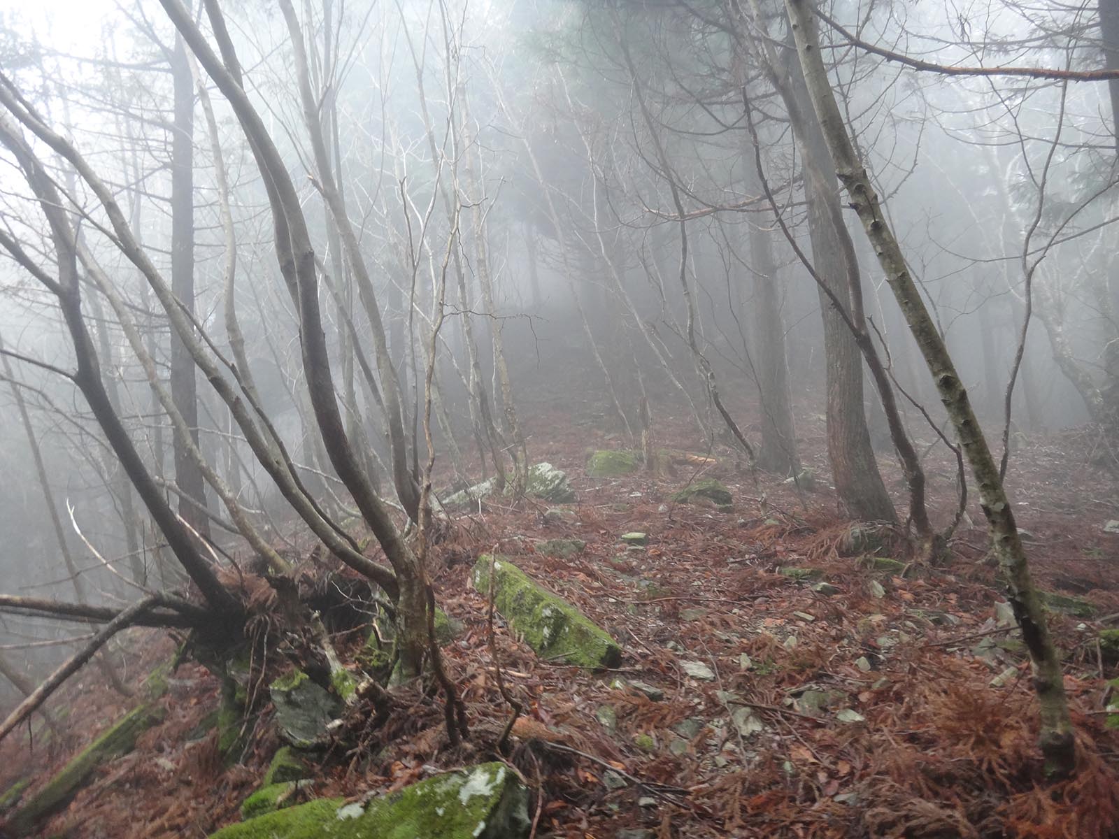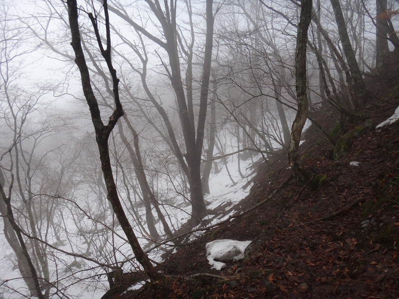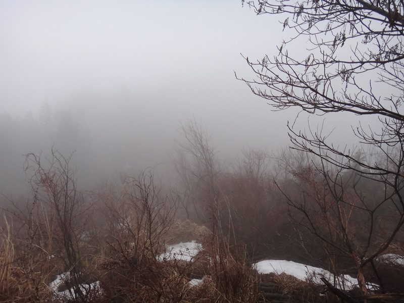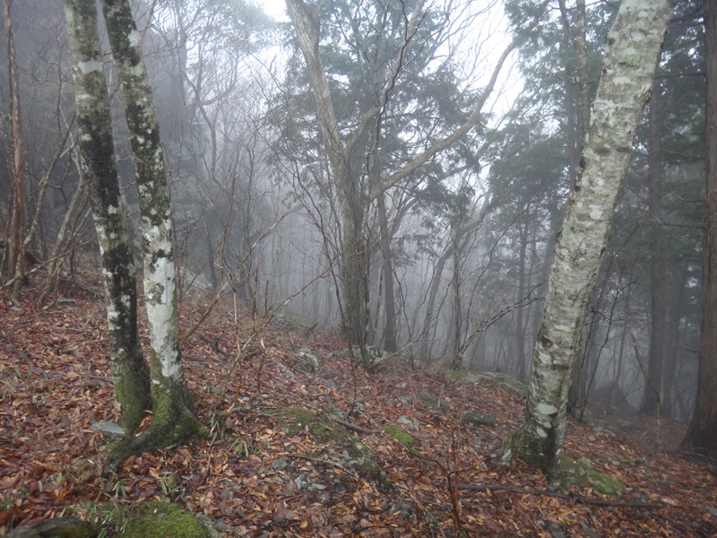 歩くこと15分ほど。 さっきの看板で750mとなっていたので、そろそろ着いてもいい頃だなぁ…… しかし山頂は見えない。 右側は谷。 左側は斜面になっている。 そのまましばらく進んでいくが、突然道が消えた。 明らかに踏み後がない。 50mほど歩くと、左側の斜面の上まで行けそうなので歩いて行ってみるが、そこにも道は無い。 これは…… 7月の寒峰を思い出す……