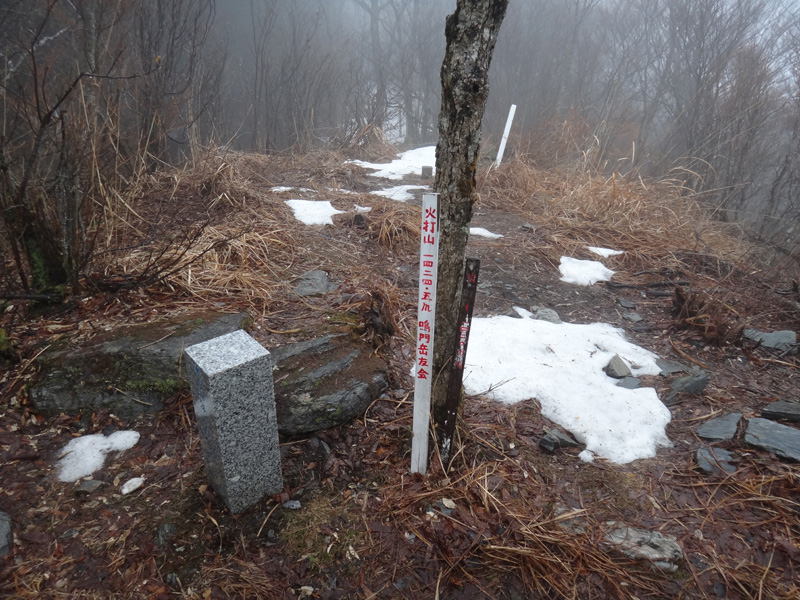 そこからも何度か小ピークを越え、火打山に到着。 当然景色は見えず。 そして、次の「白滝山」へ向かわず、引き返すことを決めた。