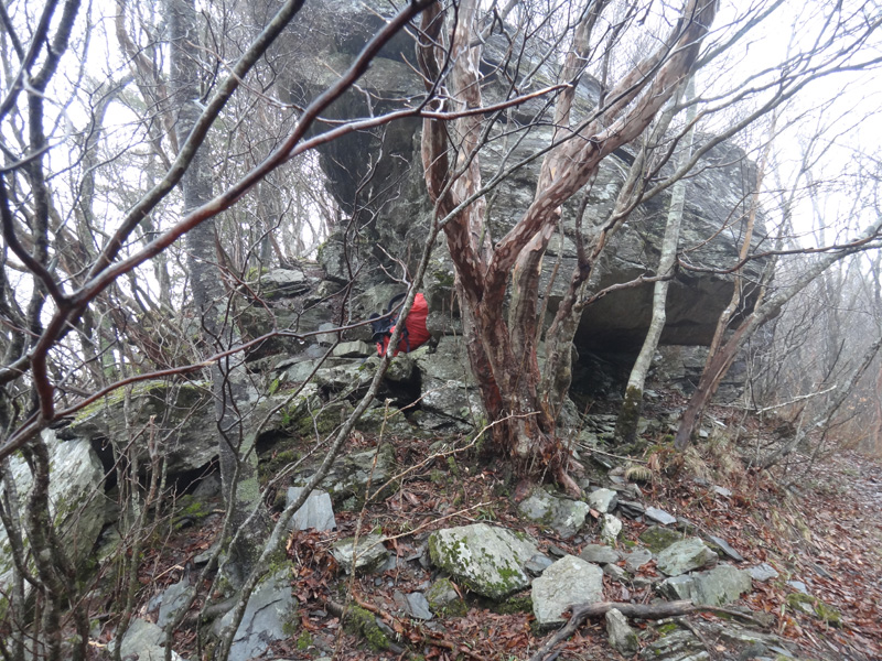 登ってくる途中で、雨をしのげる岩場を発見しておいたので、そこで休憩することに。